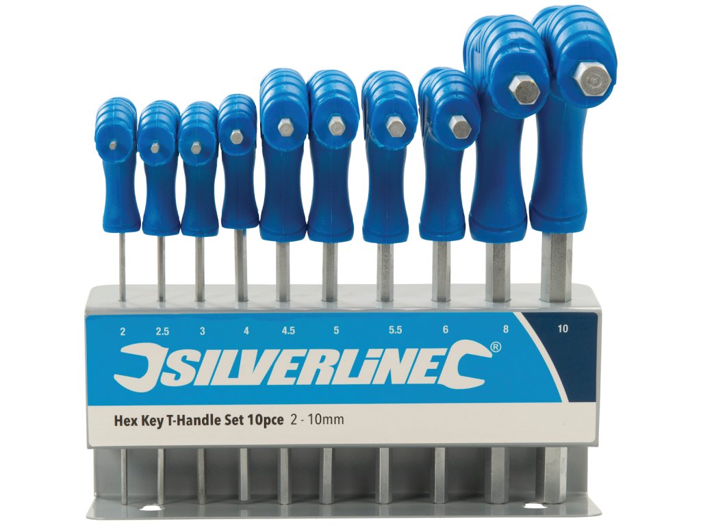 Kromirani vanadij, dvostrani, metrički šesterokutni ključevi u metalnom postolju za pohranu. Veličine: 2; 2,5; 3; 4; 4,5; 5; 5,5; 6; 8 i 10 mm.