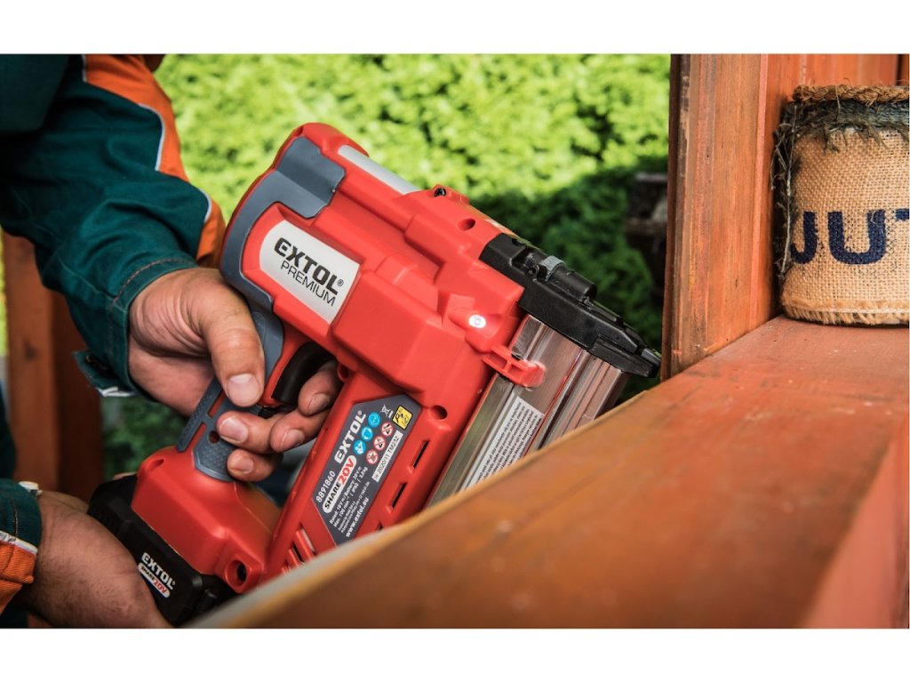 Značajke 2 u 1 ovog akumulatora/klamerice od 20 V čine ga idealnim alatom za kućnu završnu obradu kao što su stolarija, ugradnja trim traka, izolacija, plastične folije, presvlake i drugi završni radovi. Snaga baterije pruža dosljedne i pouzdane performanse zahvaljujući snažnoj litij-ionskoj bateriji od 20 V, eliminirajući potrebu za glasnim i teškim kompresorom i rukovanjem dugim crijevom za zrak. Čavao može ispaliti do 60 čavala u minuti. Prilikom rada možete birati između dva načina rada: način jednostrukog pečenja, koji se koristi za precizno pozicioniranje noktiju, i kontaktni način rada, u kojem se čavao pali kada dođe u kontakt s materijalom. Gumeni vrh štiti materijal pri kontaktu, a dvostupanjski okidač štiti korisnika od slučajnog pečenja. Baterija se može koristiti u svim vrstama alata u seriji EXTOL SHARE20 V. Zahvaljujući Li-ion tehnologiji, baterije se mogu napuniti u bilo kojem trenutku bez smanjenja njihovog kapaciteta. Li-ion baterija gubi energiju vrlo sporo zbog samopražnjenja i traje dugo napunjena i spremna za uporabu.