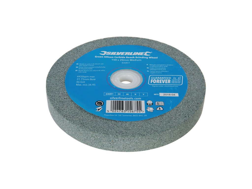46-grit brusni kotač za oštrenje alata od volframovog karbida (TCT). Pogodno za uporabu na željeznim metalima i legurama. Provrt od 31,75 mm (1-1/4") s redukcijskim čahurama od 12,7 mm (1/2"), 5/8" (15,88 mm), 3/4" (19,05 mm) i 25,4 mm (1"). Za uporabu sa svim stolnim brusilicama od 150 mm, maksimalna brzina 4.450 o / min.