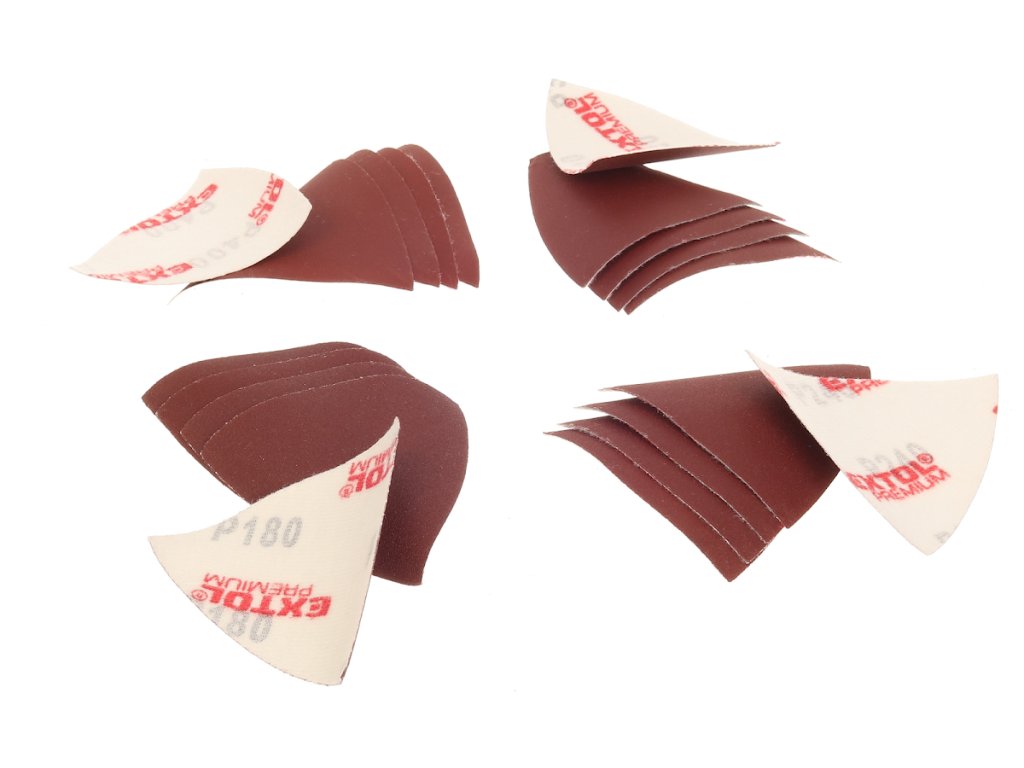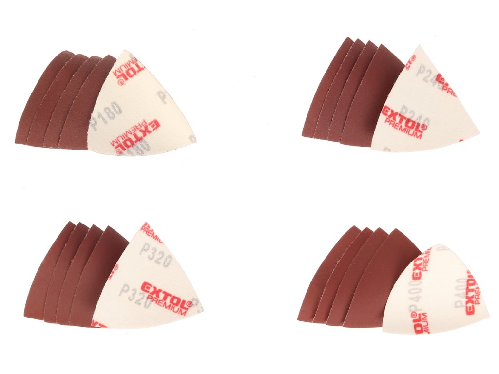 Dizajniran za delta brusilicu, čičak pričvršćivanje, bez rupa, veličine 80 × 80 × 80 mm. Paket sadrži 20 kom, mješavinu griza: 5x P180, 5x P240, 5x P320 i 5x P400.