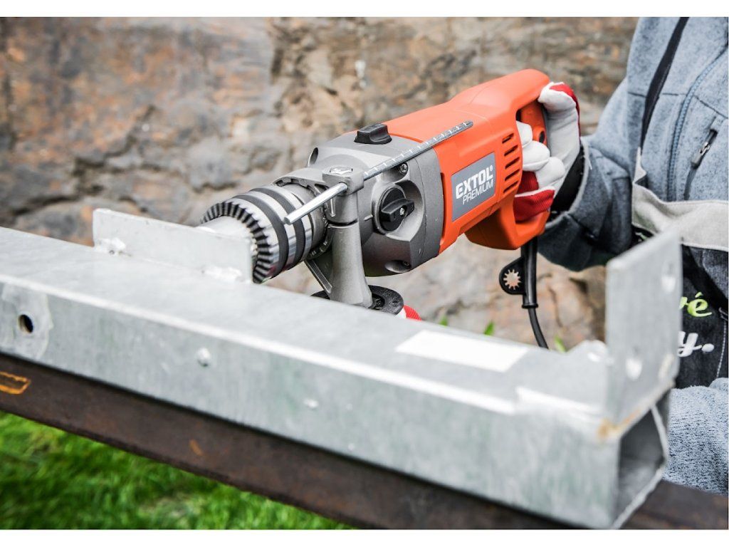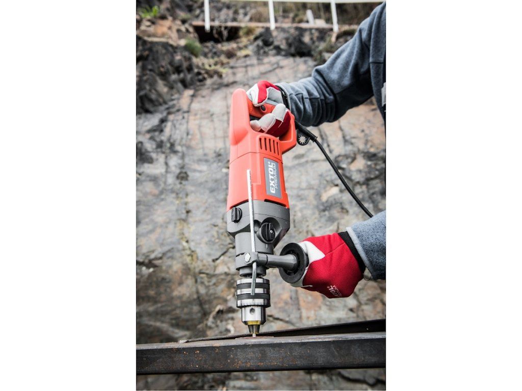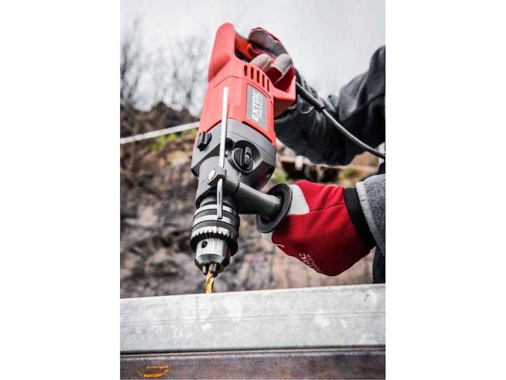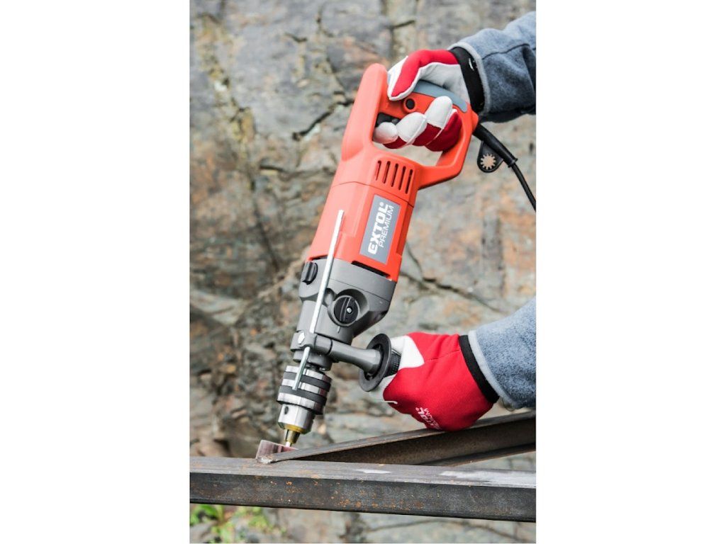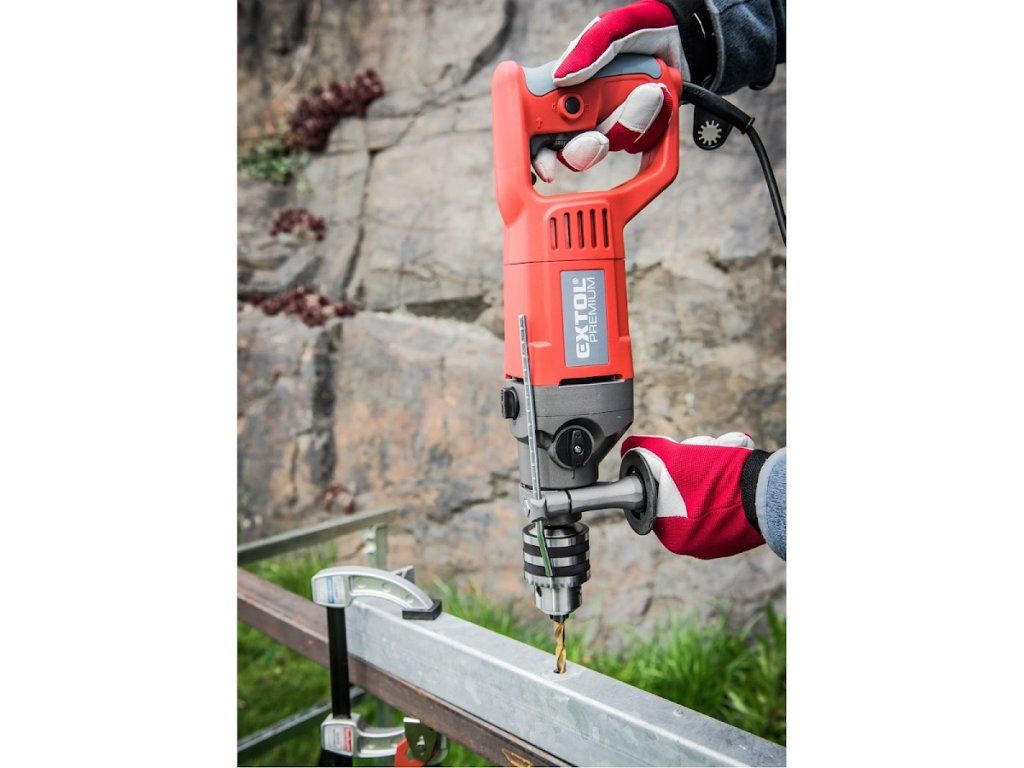 Vrlo snažna i robusna bušilica čekića sa snažnim motorom od 1050 W i glavom stezne glave s rasponom stezanja od 3 - 16 mm dizajnirana je posebno za zahtjevne radove bušenja u tvrdim materijalima, ali se može koristiti i za bušenje u mekim materijalima. Velika ručka u obliku slova "D" ne samo da osigurava udobno držanje bušilice tijekom teških radova, već i štiti vašu ruku od ozljeda. Zahvaljujući snažnim performansama, može se koristiti, na primjer, sa serpentinskim svrdlima, ubodnim pilama, krunskim bušilicama ili pilama za rupe itd. Radni prekidač omogućuje postupno i nježno pokretanje brzine za precizno točkasto bušenje, npr. u pločicama. Zahvaljujući praktičnom prekidaču za zakretanje desno / lijevo, alat se može ukloniti iz izbušenog materijala bez ikakvih komplikacija.