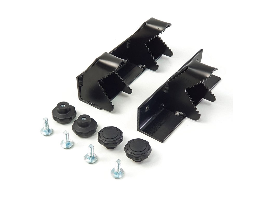 Okrugli materijal nazubljen set za postolje škripac. Budući da je izvorna obloga čeljusti škripca izrađena od čvrste gume, možda neće zadovoljiti potrebe za pričvršćivanjem svih vrsta materijala. Ove čelične čeljusti osiguravaju čvrsto i sigurno prianjanje, na primjer, pri rezanju drvenih trupaca, cijevi ili čeličnih profila. Set uključuje matice s ergonomskom glavom za brzu montažu.