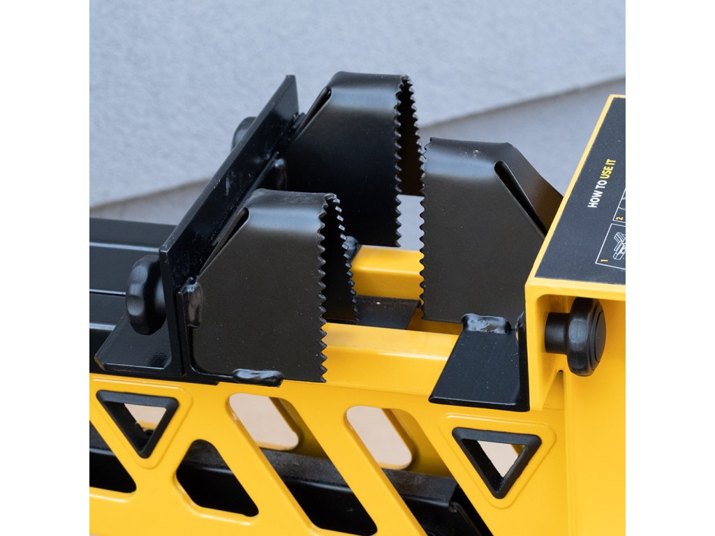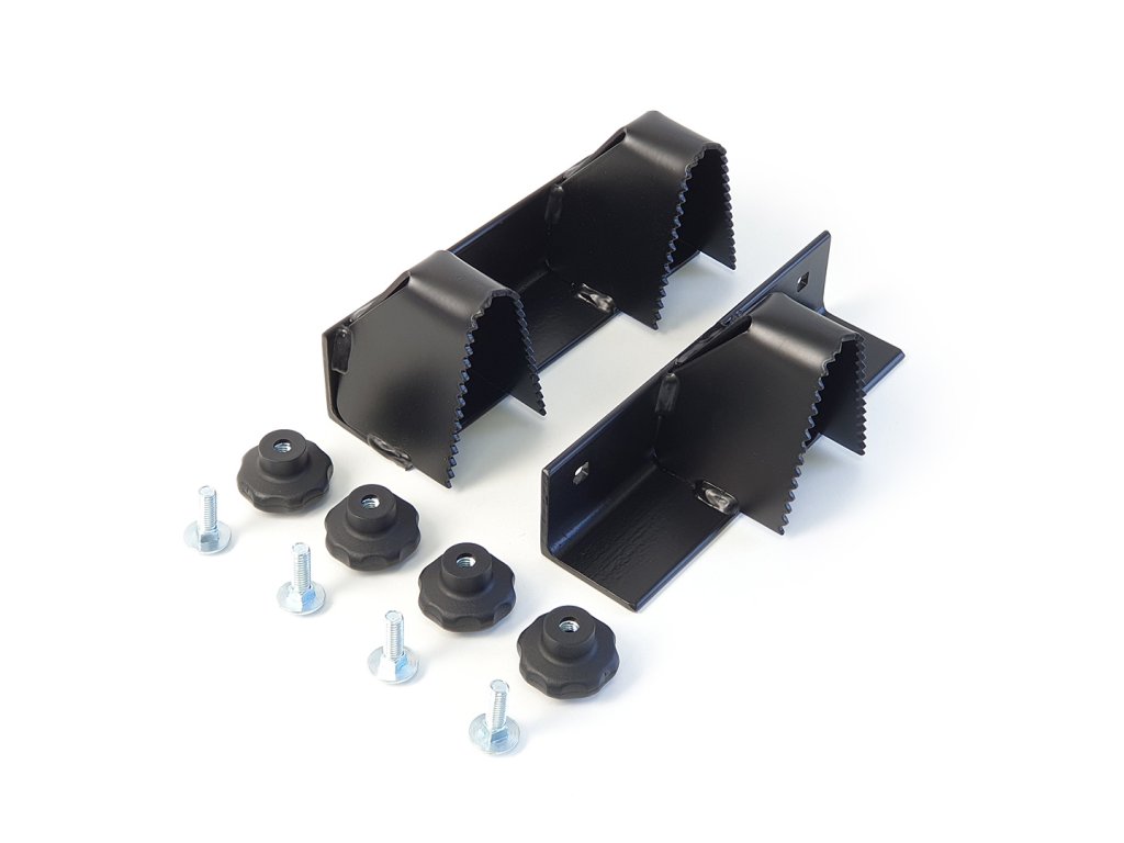 Skup nazubljenih nazubljenih priključaka za škripac postolja. Budući da je izvorna obloga čeljusti škripca izrađena od čvrste gume, možda neće zadovoljiti potrebe za pričvršćivanjem svih vrsta materijala. Ove čelične čeljusti osiguravaju čvrsto i sigurno prianjanje, na primjer, pri rezanju drvenih ili čeličnih profila, greda, cijevi i još mnogo toga. Komplet uključuje matice s ergonomskom glavom za brzu montažu.