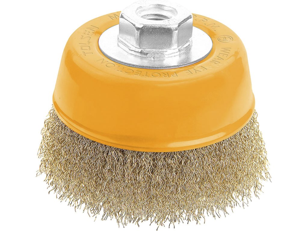 Idealno za uklanjanje hrđe i boje s metalnih površina. Promjer žice: 0,3 mm, duljina žice 30 mm, promjer četke 100 mm (promjer tijela 84 mm), matica za pričvršćivanje M14 × 2 mm, maksimalna brzina 8.500 o / min, visina četke 77 mm.