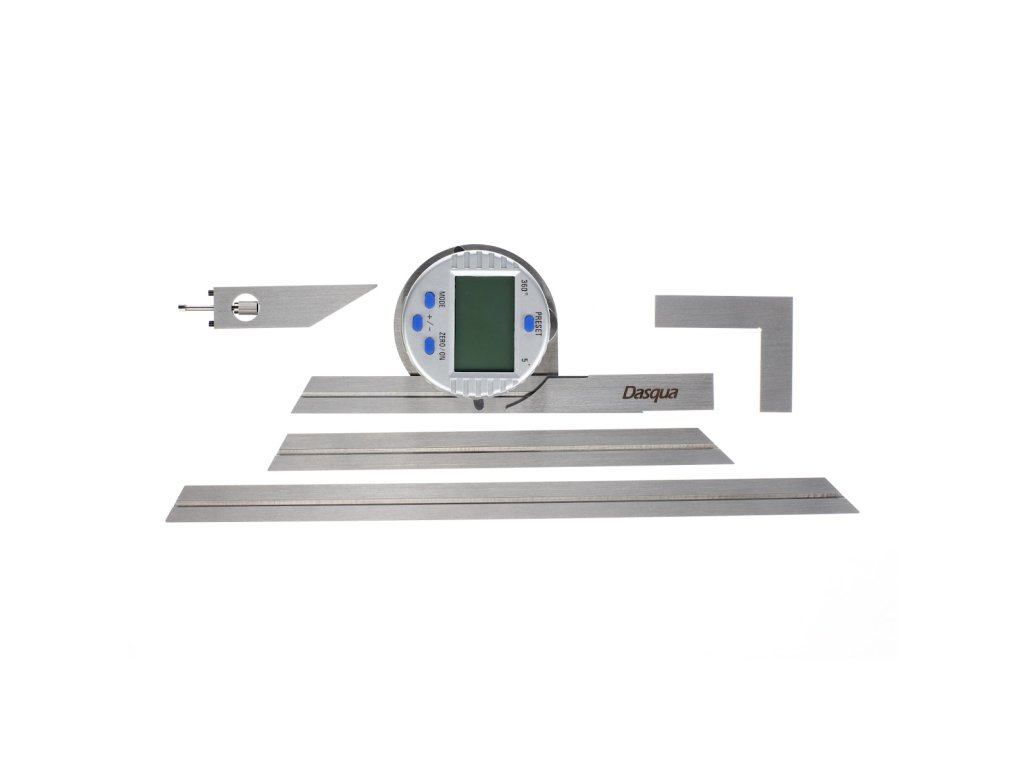 Digitalni kutomjer dometa 360°, točnosti 5 ́, razlučivosti 30" (0,008°) ergonomski je neusporediv s klasičnim. Dvoredni LCD prikazuje vrijednost u 000°00 ́30" i decimalni oblik 000.008° i označava postavljeni način mjerenja. Postoje 3 načina čitanja 0 - 90 °, 0 - 180 °, 0 - 360 ° i lako se mogu prebaciti gumbom. Mjerač je opremljen preciznim vijkom za podešavanje ravnala, može se resetirati u bilo kojem položaju kako bi se izmjerila relativna vrijednost ili unaprijed postavio kut. Izrađena je od nehrđajućeg čelika, mjernih površina uzemljenih i poliranih. Digitalni izlaz - RS-232C serijsko sučelje, napajano 1× CR2032 baterijom - nije uključeno. Isporučuje se u drvenoj kutiji zajedno s tri izmjenjiva ravnala u duljinama od 150, 200, 300 mm i pomoćnim ravnalom za pričvršćivanje okomito na bazu.