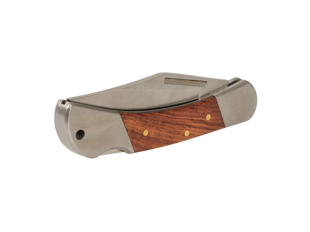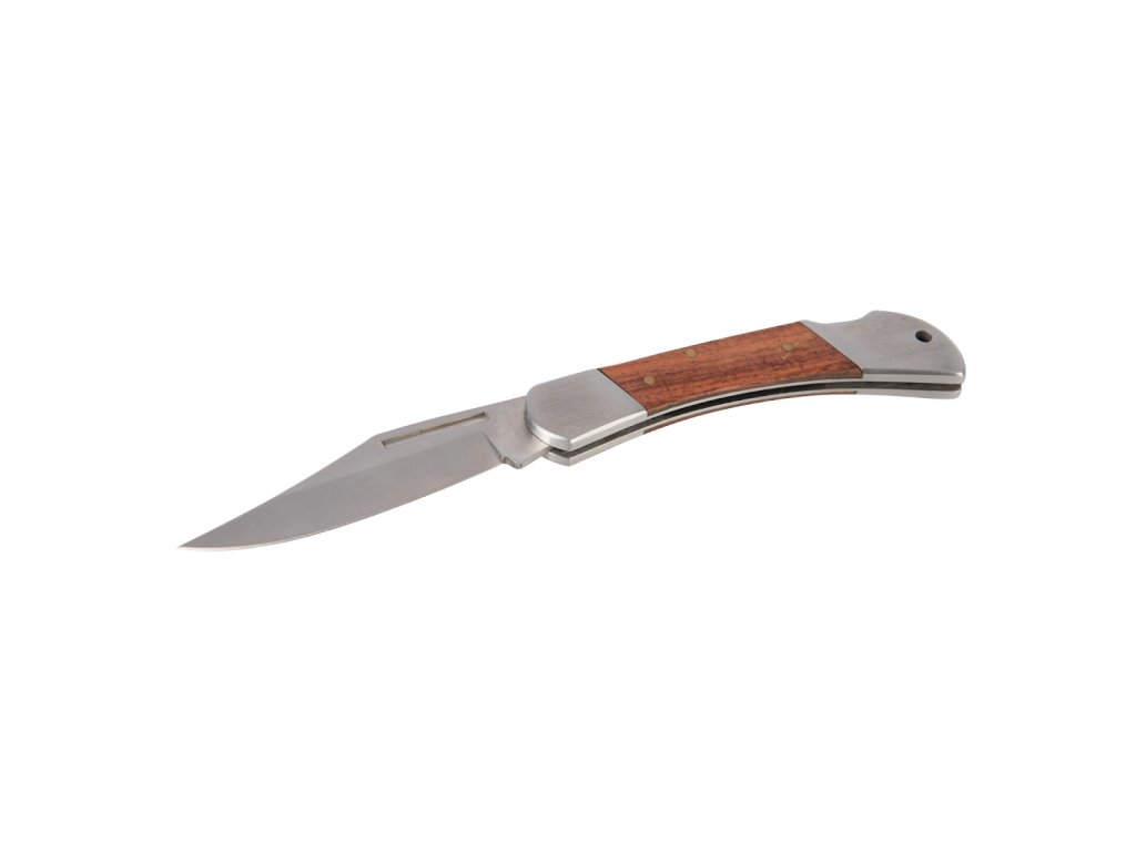 Preklopni nož od nehrđajućeg čelika s bravom oštrice, drvenom ručkom i rupom za uzicu. Presavijena duljina 115 mm.