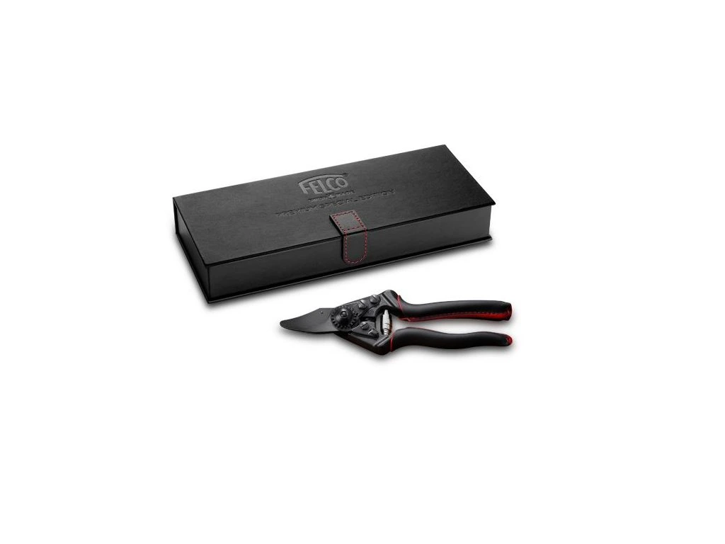 Kod alata crne boje, crveni konac, ušiven u meku crnu kožu drške, u kontrastu je s FELCO bojama. Škare pohranjeni su u crnoj poklon kutiji s ugodnom mekom završnom obradom i umetnutim potvrda o podrijetlu škara.