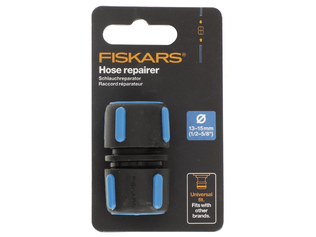 Brzi popravak oštećenih crijeva od 1/2 - 5/8" ili njihovih produžetaka. Izrežite oštećeni dio i spojite dva kraja crijeva. SoftGrip dodirne točke osiguravaju sigurno rukovanje, čak i kada su mokre. Udobni su za držanje, čak iu hladnom vremenu, u usporedbi s metalnim dijelovima za navodnjavanje. Kodiranje u boji za jednostavno spajanje na Fiskars crijeva. Univerzalna veza kompatibilna je s drugim markama. Visina: 11,6 cm, duljina: 6,8 cm, širina: 3,6 cm. Težina: 0,02 kg.