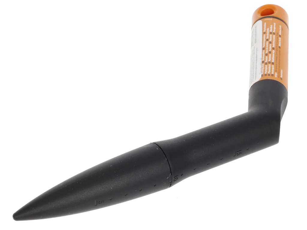 Sadni kolac pravi rupe u tlu na pravoj dubini za sadnju sjemena do dubine od 150 mm. Da biste provjerili dubinu, sa strane je označena ljestvica. Jedinstvena ručka u obliku slova L pruža maksimalni okretni moment i udobnost tijekom rada. Lagan i vrlo jak, otporan na vremenske uvjete i jednostavan za čišćenje. Dužina: 26,2 cm, širina: 13 cm. Težina: 0,08 kg.