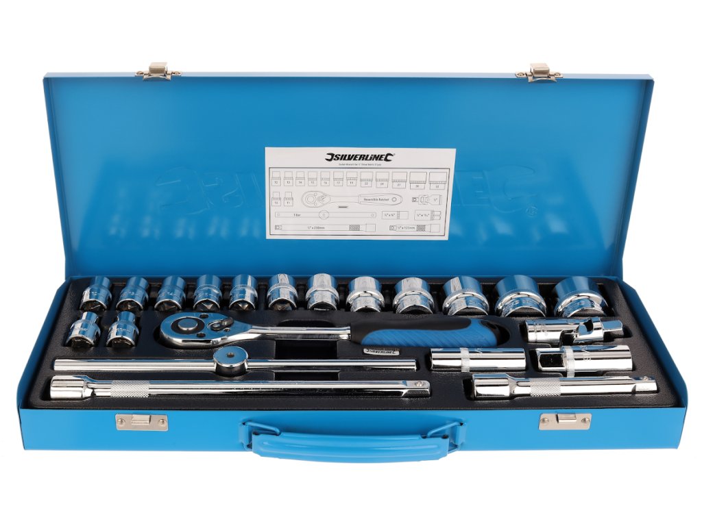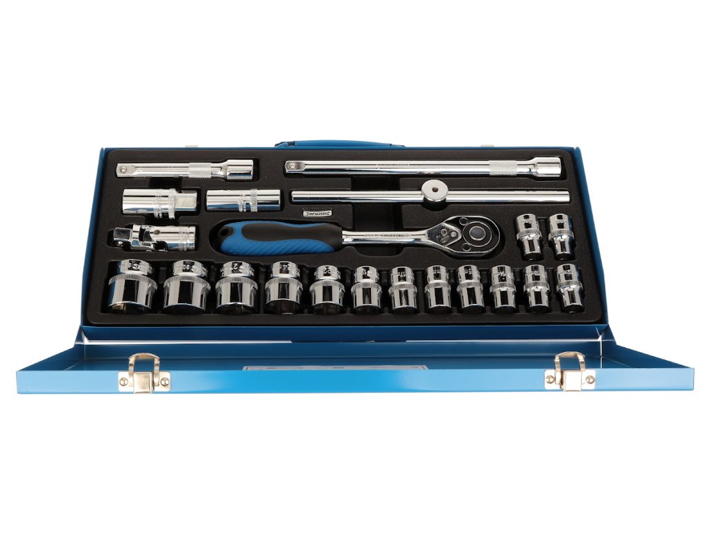 Osim čegrtaljke i spoja od 1/2", set uključuje ključeve za utičnice: 10, 11, 12, 13, 14, 15, 16, 17, 19, 22, 24, 27, 30 i 32 mm, ključeve svjećice 13/16" i 5/8", produžetak 125 i 150 mm.