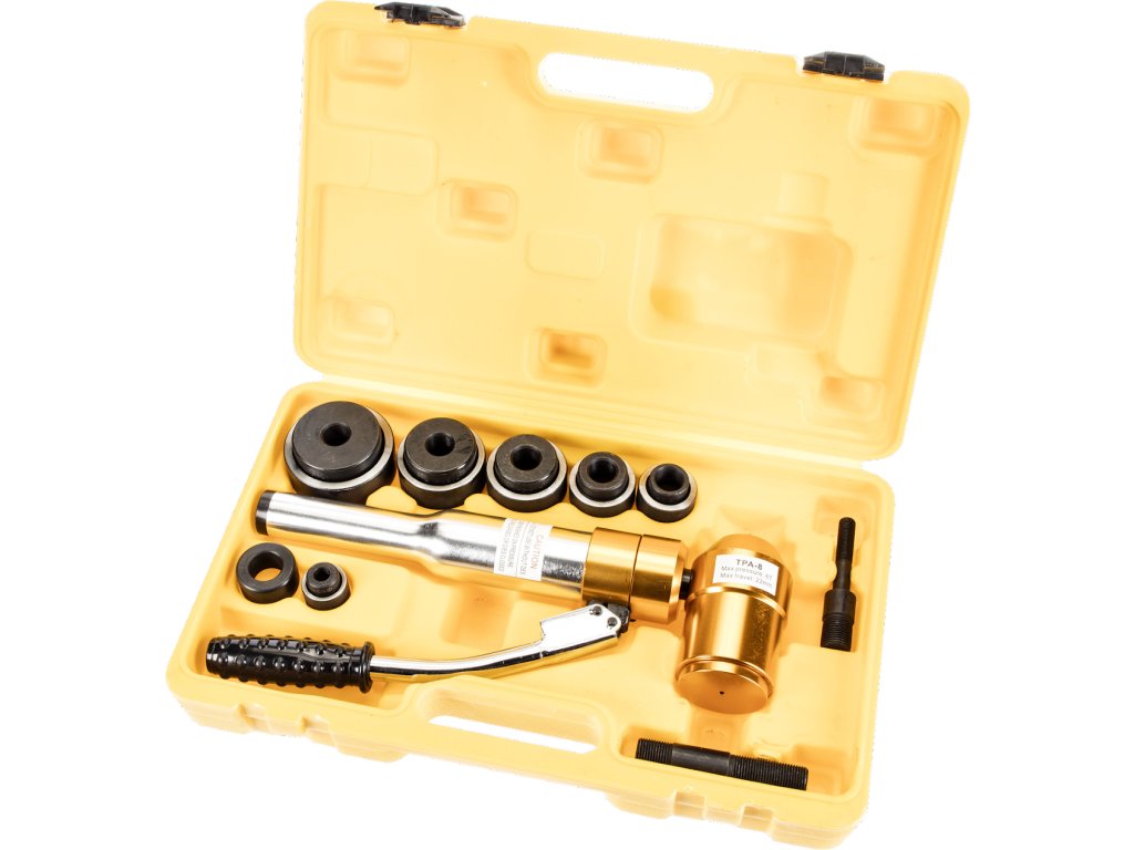 Uređaj za jednostavno i čisto stvaranje rupe većeg promjera. Glava je izrađena od visokokvalitetne AL legure za jednostavan transport i može se rotirati za 360 ° radi lakšeg rukovanja i pristupa materijalu. Sve što trebate učiniti je izbušiti rupu za vodilicu. Debljina cilindra 60 kN (6 t), hod alata 22 mm, debljina materijala 3 mm (za blagi čelik), 1,5 mm (za nehrđajući čelik, ovisno o tvrdoći). Osim radne jedinice, set u plastičnom kućištu sadrži i set udaraca i udaraca s ø 1/2" (~ 22,5 mm), 3/4" (~ 28,3 mm), 1" (~ 34,6 mm), 1 1/4" (~ 43,2 mm), 1 1/2" (~ 49,6 mm) i 2" (~ 61,5 mm), velikom i malom iglom i potpornim prstenom.