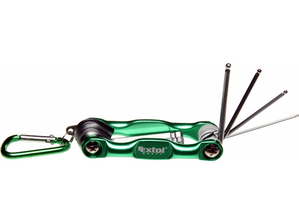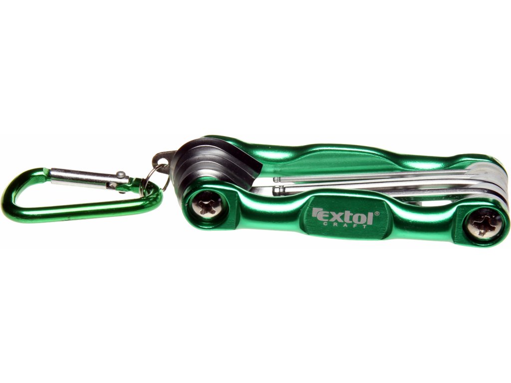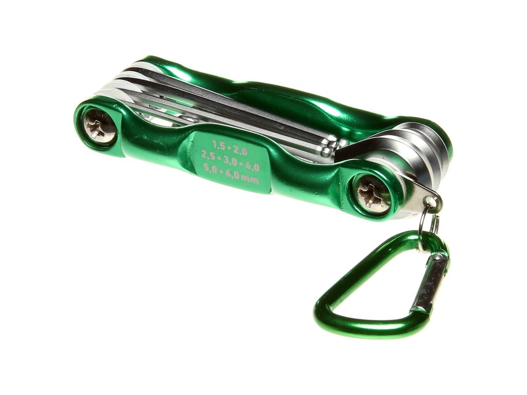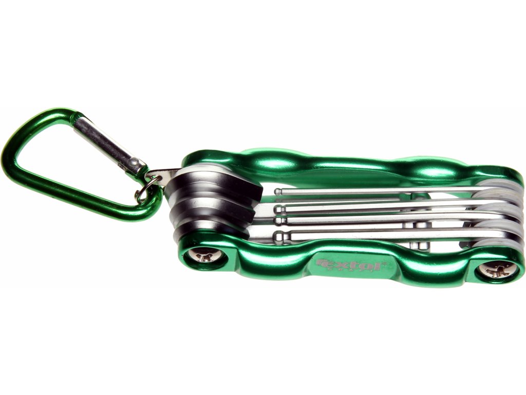 Sklopivi ključ postavljene veličine 1,5; 2; 2,5; 3; 4; 5 i 6 mm, kuglasti kraj za rad pod kutom do 30 °, ručka izrađena od visokokvalitetne aluminijske legure, zelene, plave i crvene boje, dopunjena karabinerom.