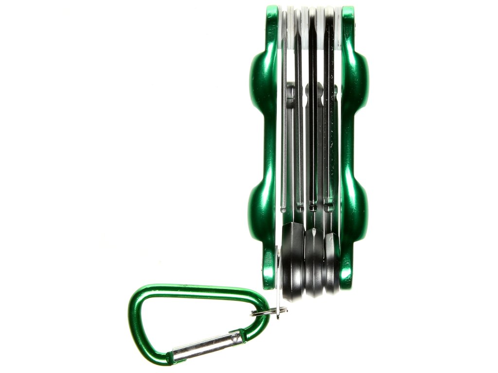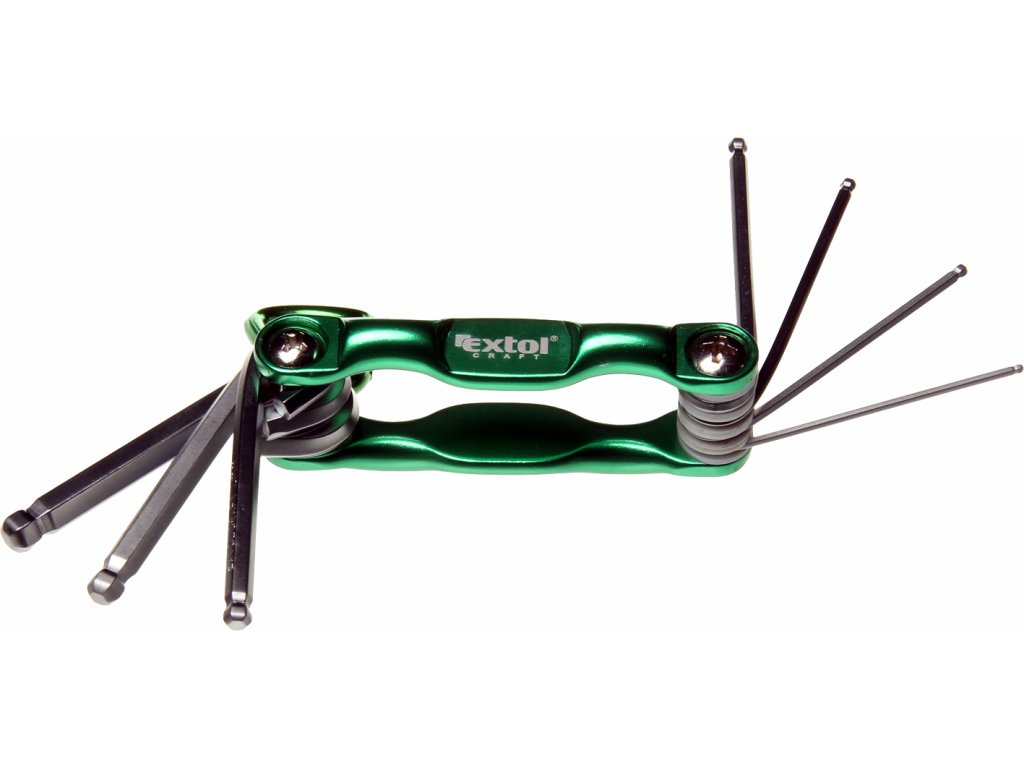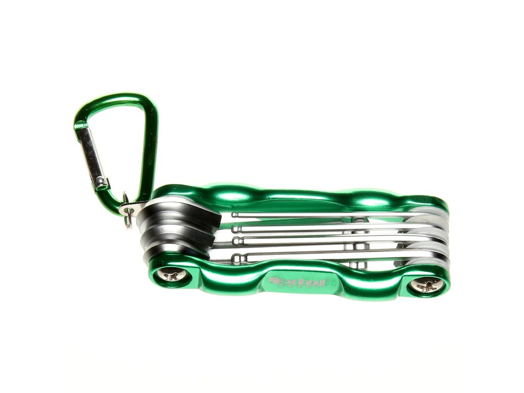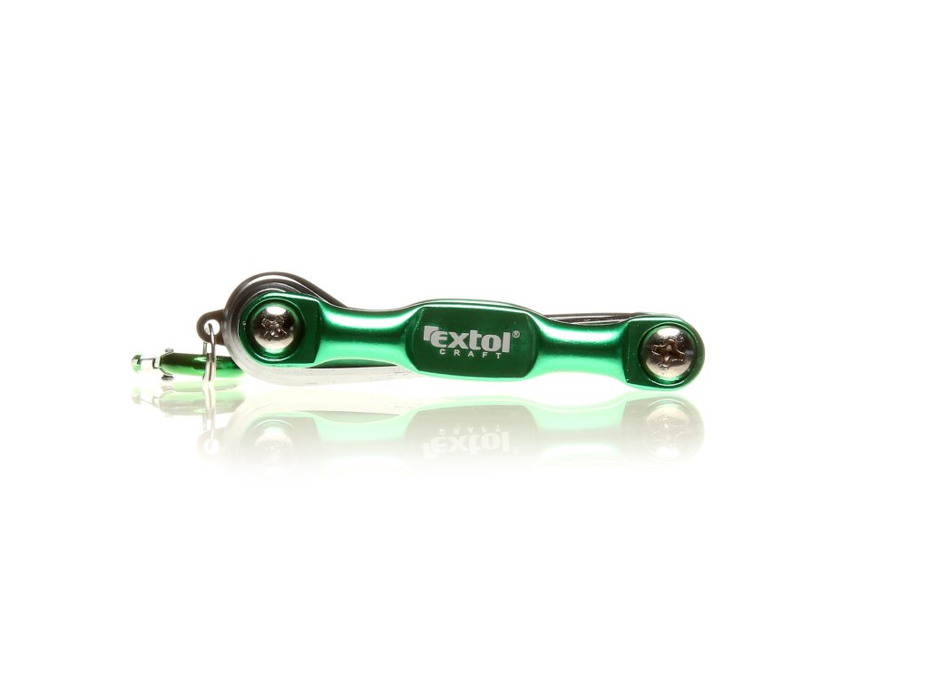 Sklopivi ključ postavljene veličine 1,5; 2; 2,5; 3; 4; 5 i 6 mm, kuglasti kraj za rad pod kutom do 30 °, ručka izrađena od visokokvalitetne aluminijske legure, zelene, plave i crvene boje, dopunjena karabinerom.