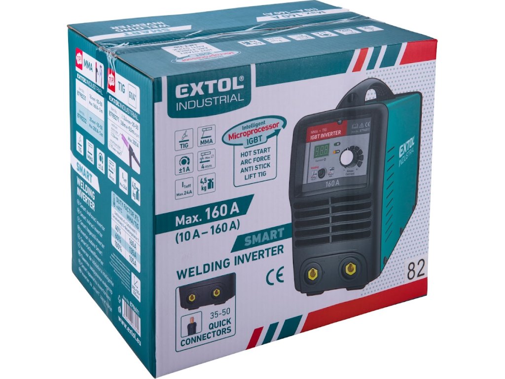 Extol® Industrial-ovi profesionalni računalno upravljani pametni pretvarači su aparati za zavarivanje treće generacije za MMA i TIG zavarivanje, u kojima se koristi najnovija IGBT mikroprocesorska tehnologija. Pretvarači su opremljeni jasnom upravljačkom pločom sa zaslonom koji prikazuje zadanu točku struje zavarivanja i vrlo su jednostavni za rukovanje. Zahvaljujući sofisticiranoj elektronici, struja zavarivanja može se vrlo fino podesiti precizno na jedinice. Pretvarači za zavarivanje mogu se koristiti i s posebnim kabelom za zavarivanje opremljenim crijevom za spajanje na izvor plina za zaštitu argona i TIG bakljom s volframovom elektrodom. Ova metoda je vrlo učinkovita za zavarivanje nehrđajućeg čelika i čelika, osobito lijevanog željeza, bakra, titana i nikla. TIG kabeli za zavarivanje mogu se kupiti za pretvarače. Pretvarači se isporučuju bez kabela za zavarivanje.