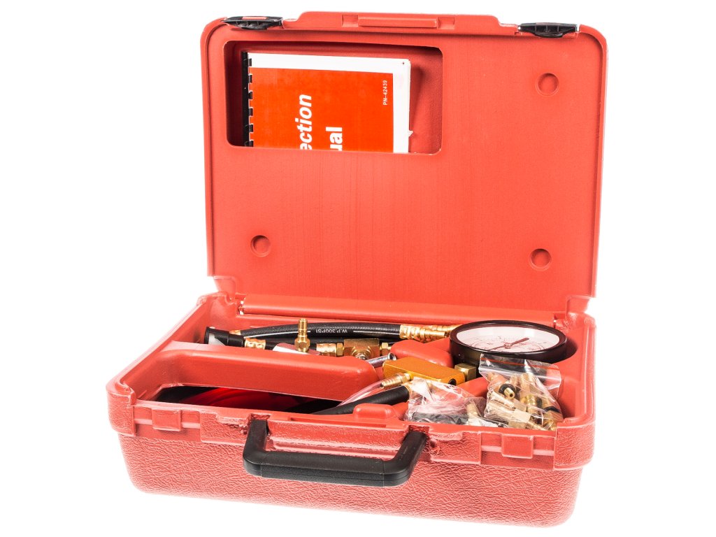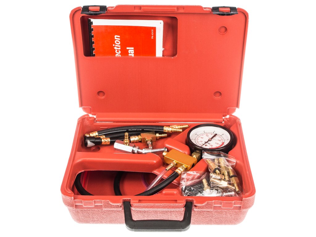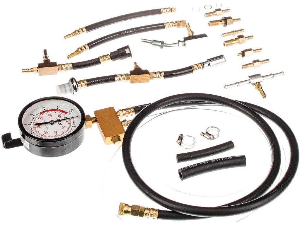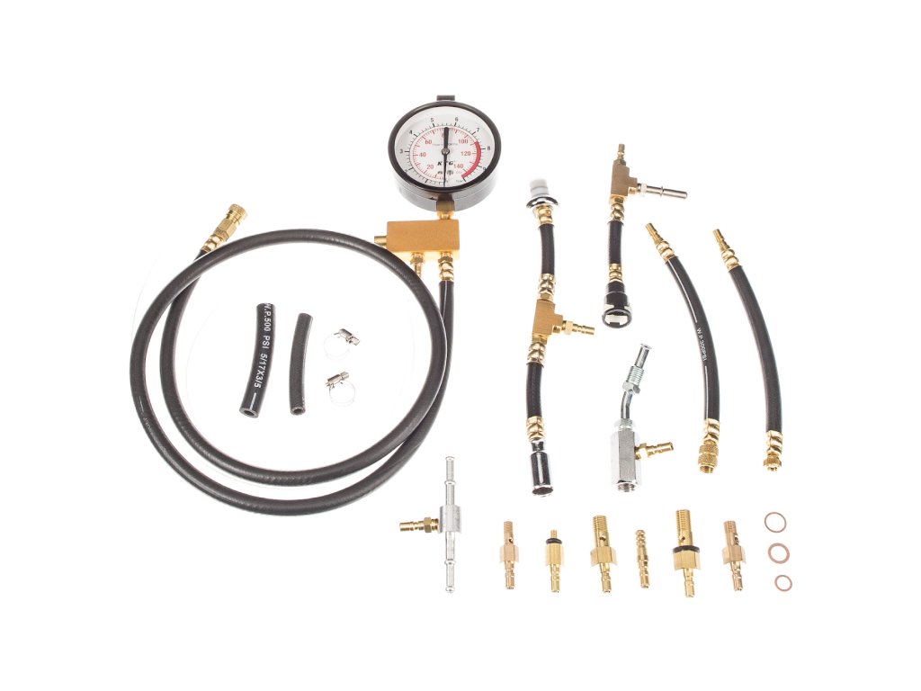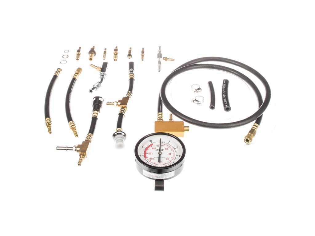 Manometar s rasponom od 0 – 10 bara (0 – 140 psi), zaštita od udara, potrebni adapteri i crijeva. Pogodno za mjerenje Bosch AFC, MPC, Digijet/Digifantexcept i C.I.S. sustava ubrizgavanja goriva na Chrysler, Ford, GM i japanskim vozilima. Pohranjeno u plastičnoj kutiji.