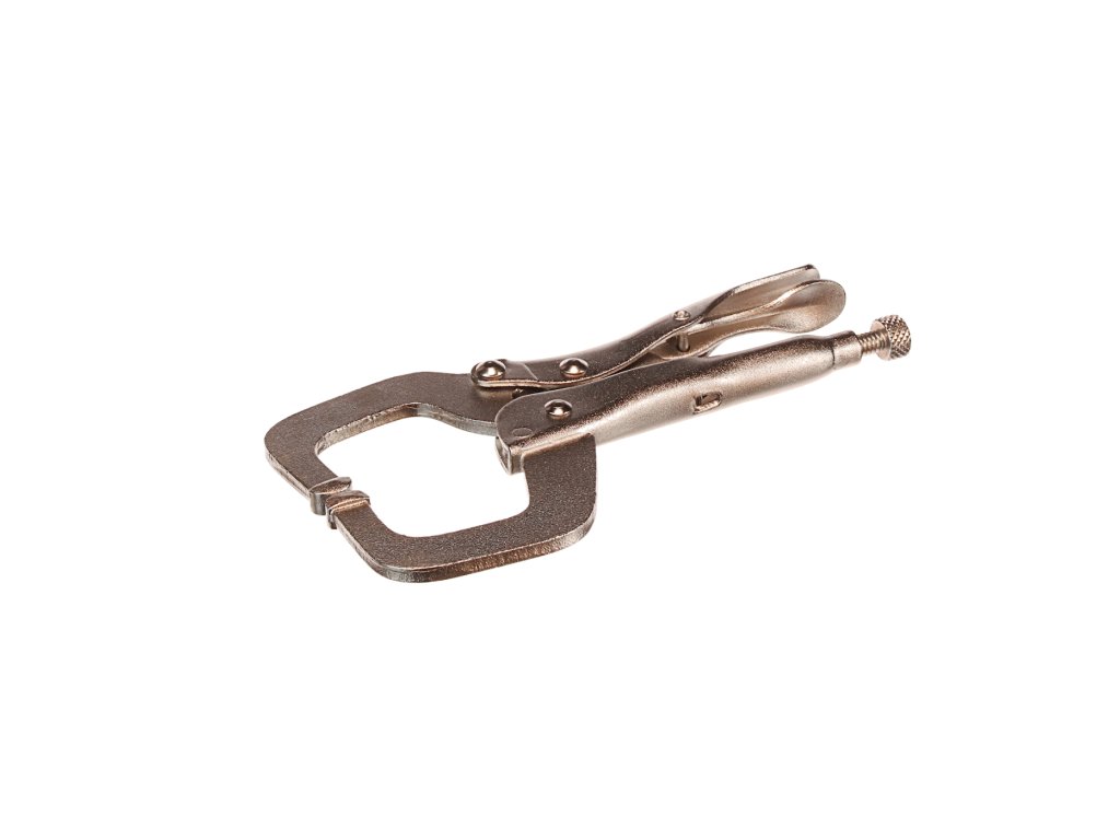Praktična, samozaključavajuća kliješta u obliku slova C. Koriste se za stezanje materijala kružnim presjekom, profiliranim i ravnim materijalom, npr. tijekom zavarivanja. Rad jednom rukom, visoki pritisak stezanja zbog prijenosa stezne poluge. Podešavanje ručnim vijkom. Raspon stezanja: 0 – 40 mm. Dimenzije 170(185)x88(115)x15 mm. Materijal: čelik.