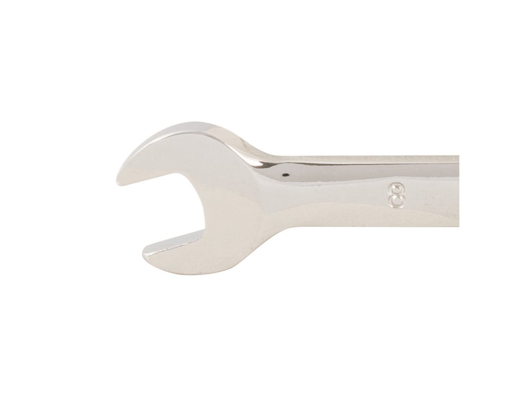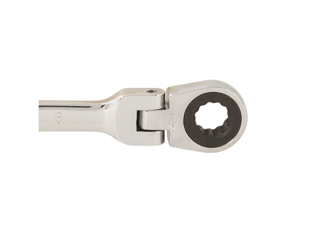 Gašeni i kaljeni kromirani vanadijev ključ s poliranom završnom obradom za otpornost na koroziju. Kombinacija bočnog ključa i ključa s čegrtaljkom od 5°, okretnom glavom od 180°. Omogućuje jednostavan pristup u skučenim prostorima.