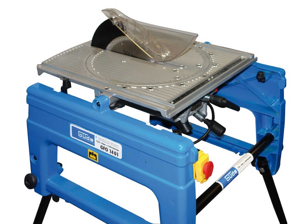 Konstrukcija: robustan okvir od lijevanog željeza s transportnim kotačima, aluminijski radni stol (→ 390 x 460 mm), štitnik lista pile, Priključak/vreća za izvlačenje, uzdužno/kutno zaustavljanje, stezaljka za brzo otpuštanje obratka, preklopne stojeće noge.