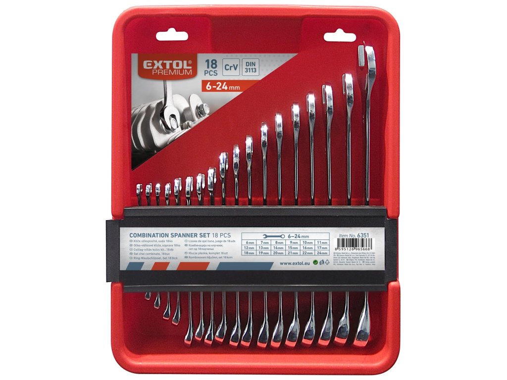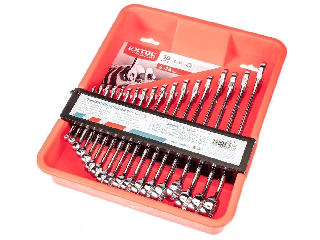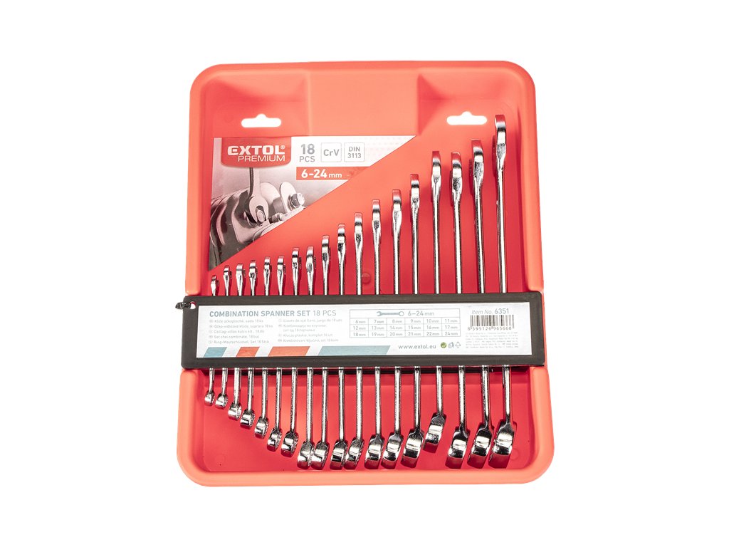 Komplet kombiniranog prstena i bočnih ključeva izrađenih od visokokvalitetnog CrV čelika u veličinama 6, 7, 8, 9, 10, 11, 12, 13, 14, 15, 16, 17, 18, 19, 20, 21, 22 i 24 mm. Polirana glava ključa, tijelo kovano od jednog komada čelika, pakirano u plastično kućište s mogućnošću vješanja na zid.