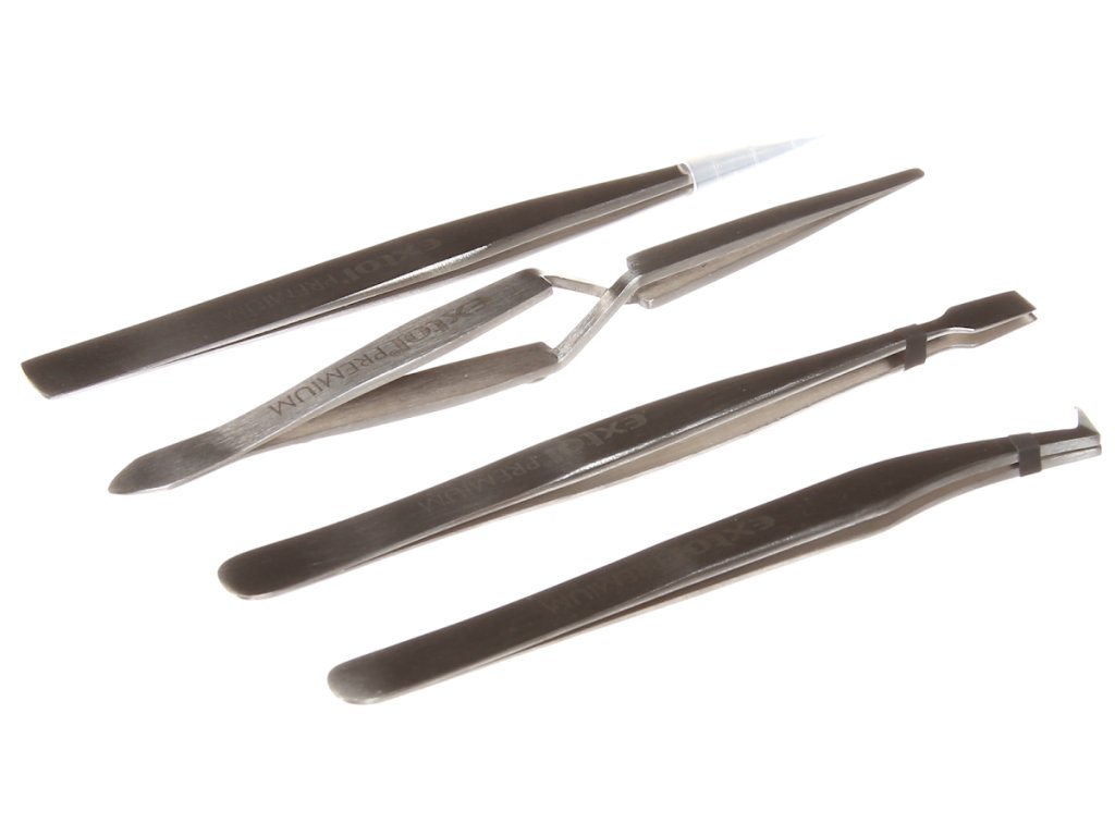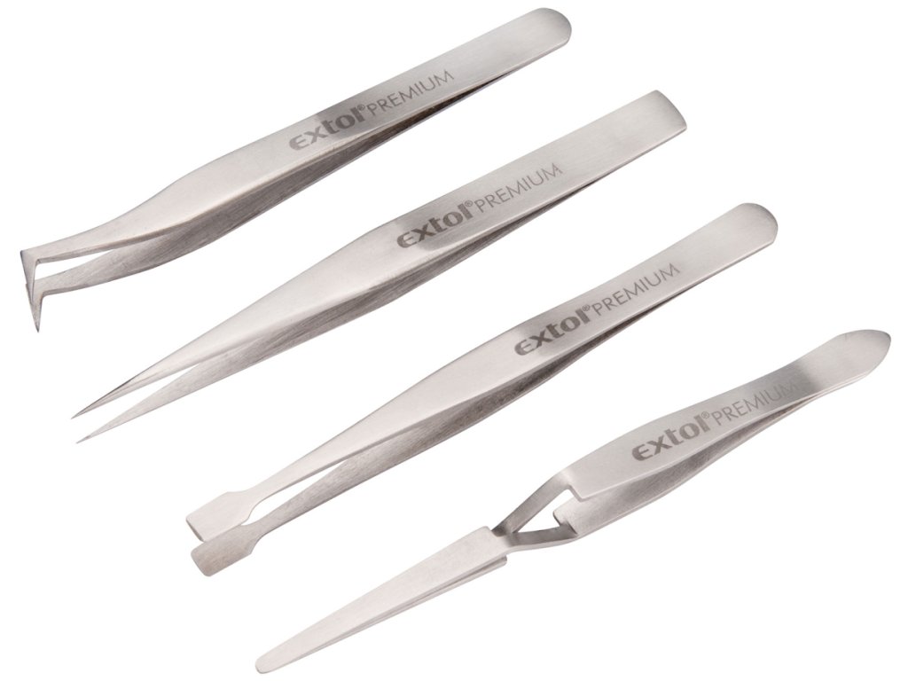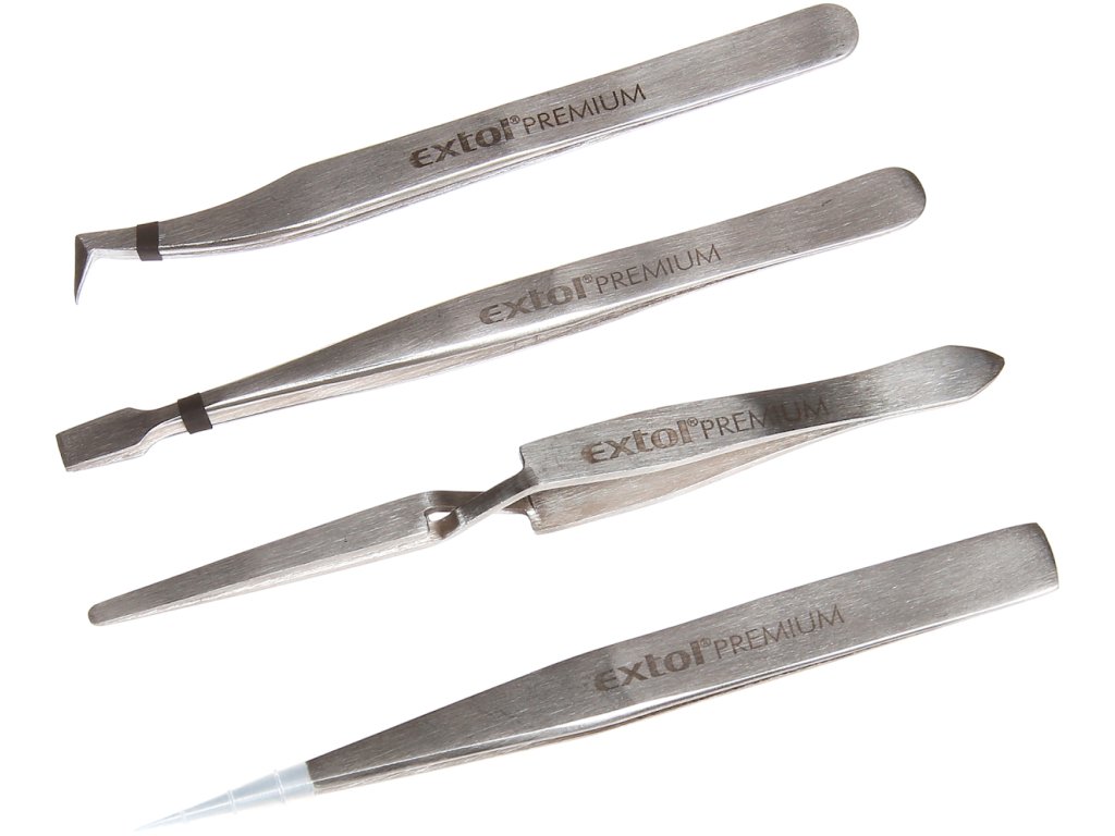 Sadrži 4 kom: pinceta od igle 126 mm, ravna 118 mm, poprečno samozaključavanje sa zaobljenim krajem 126 mm, zakrivljena oštrim vrhom 113 mm, izrađena od nehrđajućeg čelika 201 otporna na kiseline i koroziju, otvrdnuta na HRC30, koja se koristi za razne osjetljive radove u radionici i kod kuće.