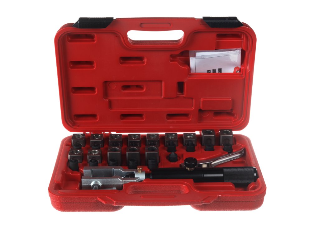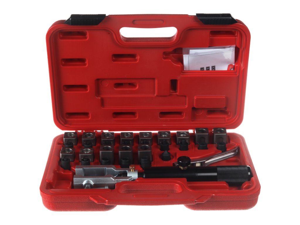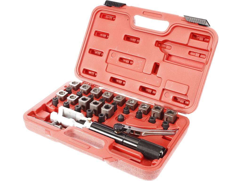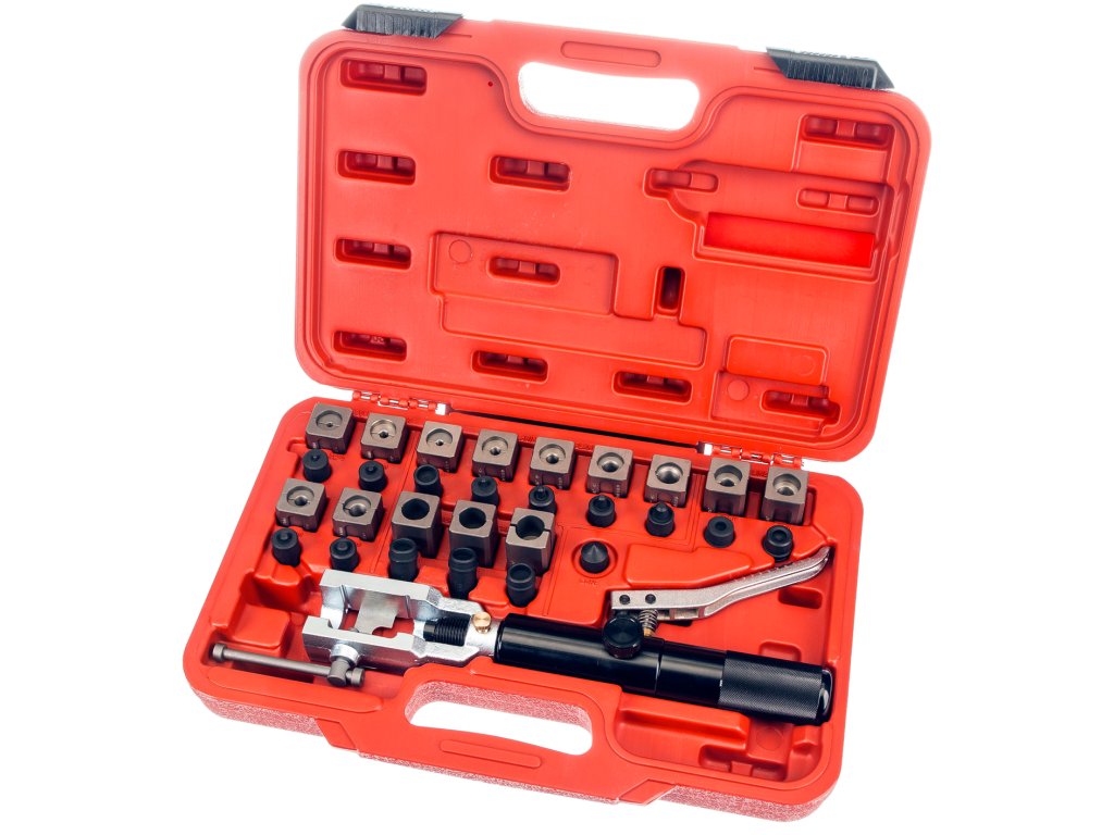 Mobilni hidraulički jig omogućuje vam stvaranje potrebnih oblika krajnjih kreveta kočnice , goriva, hlađenja i drugih krugova za njihovu savršenu nepropusnost i povezivanje. Komplet uključuje potrebne dijelove za završetak: ISO/DIN "Mjehurić" (4, 6, 8 i 10 mm), dvostruki rub (3/16", 1/4", 5/16", 3/8" i 1/2"), Dovod goriva (5/16" i 3/8"), plug-in priključak (1/4", 5/16" i 3/8") i konus od 45°. Uredno se čuva u plastičnoj kutiji.