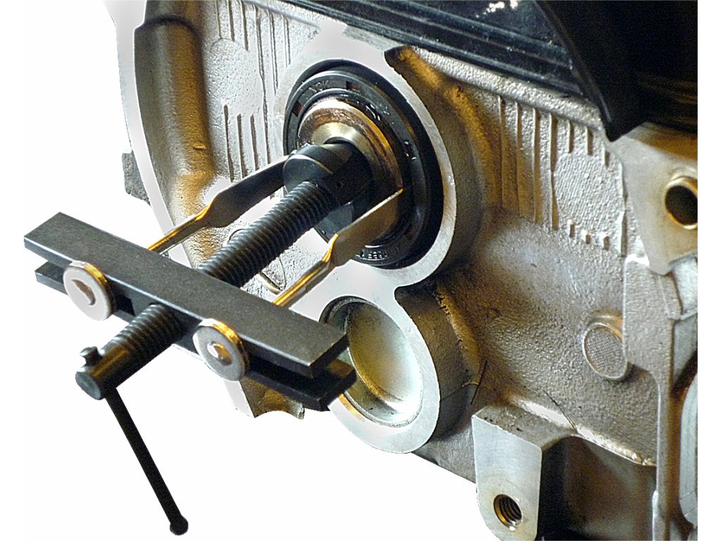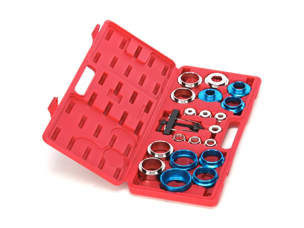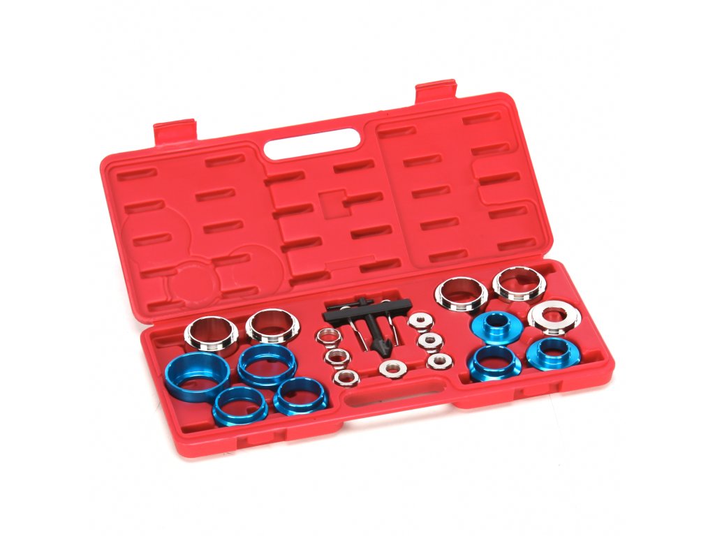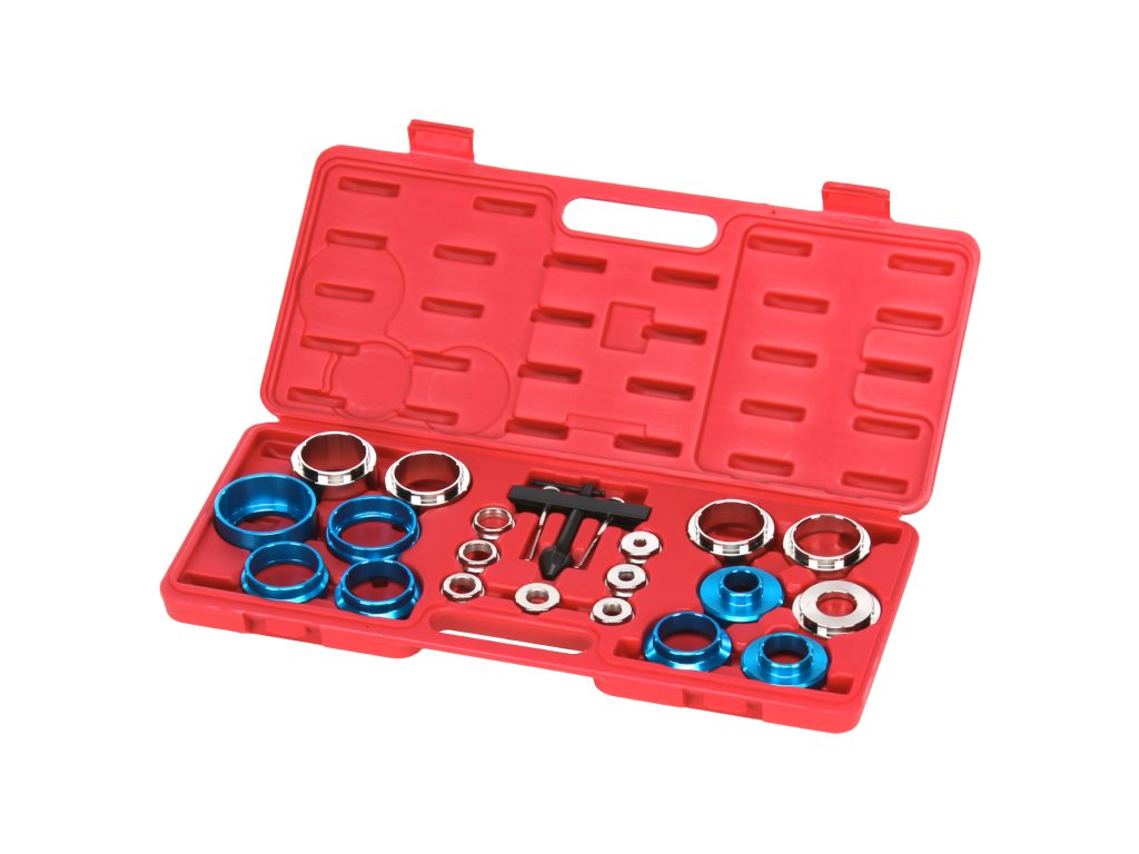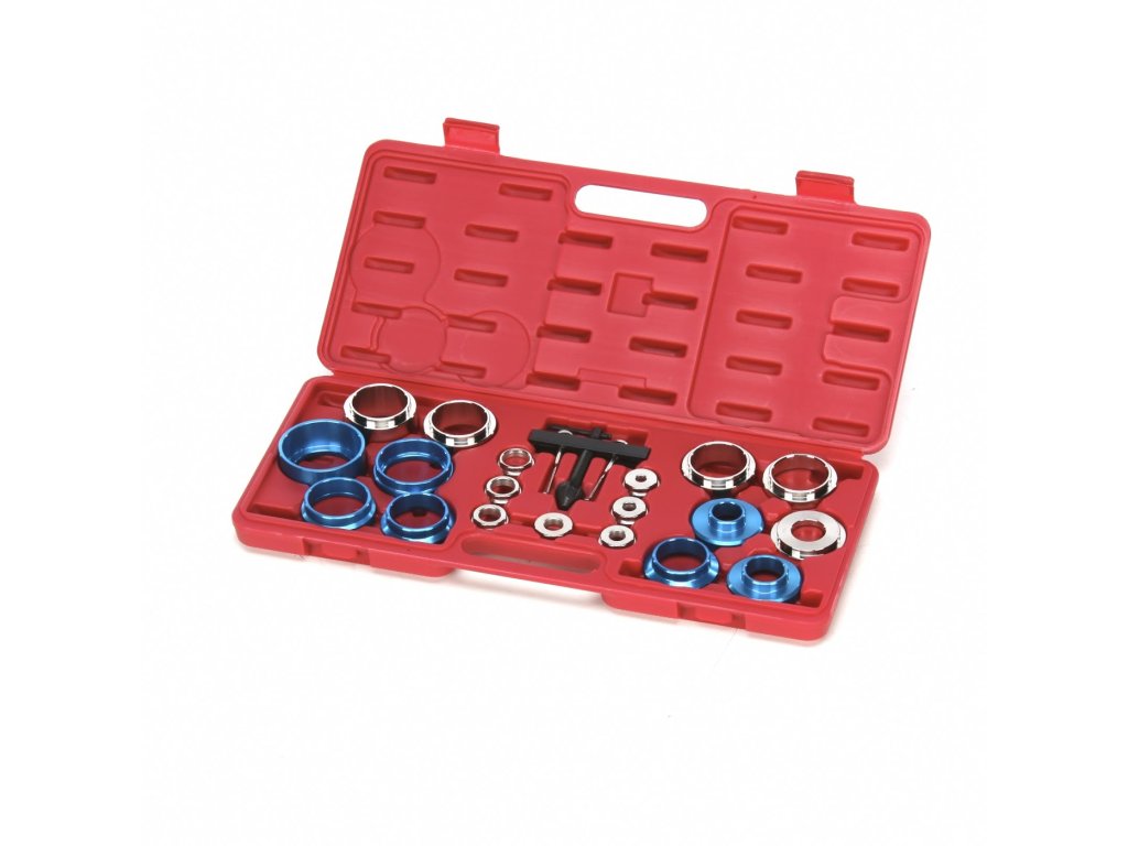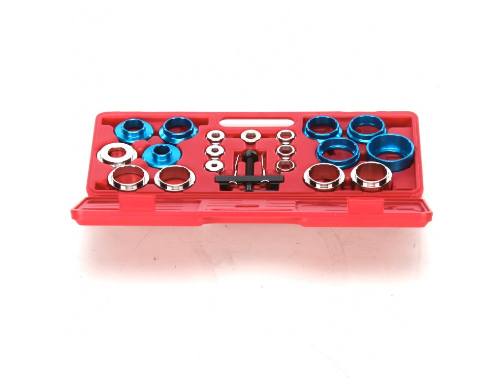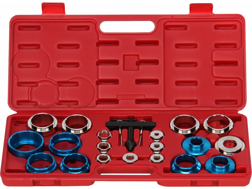 Komplet omogućuje jednostavno i sigurno uklanjanje i ugradnju brtvenih prstenova osovina. Univerzalna uporaba uključuje širok raspon vozila s brtvama promjera 27 – 58 mm. Plavi adapteri za montažu izrađeni su od aluminija kako bi se spriječilo oštećenje površine osovine. Pohranjeno u plastičnoj kutiji.