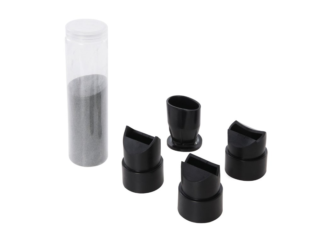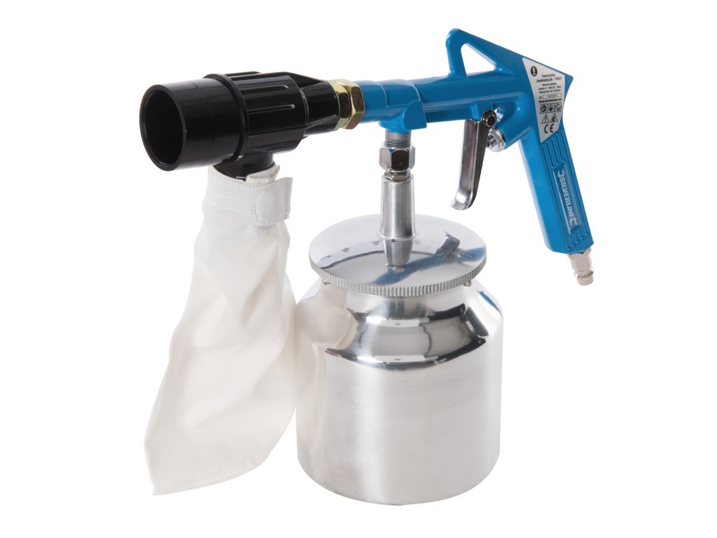 Pištolj za pjeskarenje s 4 mlaznice različitih veličina. Alu abrazivni spremnik od 850 ml s jednostavnim uklanjanjem za brzo punjenje. Meke gumene mlaznice brtve na ravnim i konturiranim površinama. Idealno za lokalno uklanjanje prljavštine, boje, hrđe itd. Uključuje pištolj za pjeskarenje zraka, 4 x gumene mlaznice, 500 g finog pijeska i vrećicu za prikupljanje recikliranog pijeska. Uključuje i britanske i europske 1/4" zračne brze spojnice. Potrošnja zraka 115 l/min, radni tlak 6,2 bara (0,621 MPa)