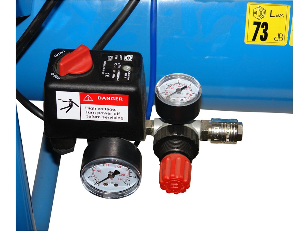 Oprema: 2 manometra (→ prijemnik zraka / mjerenje radnog tlaka), 2 izlaza komprimiranog zraka (→ metalne brze spojnice), CONDOR® tlačni prekidač, reduktor tlaka, sigurnosni ventil za rasterećenje, 1,2 m H07 RN-F električni kabelski priključak