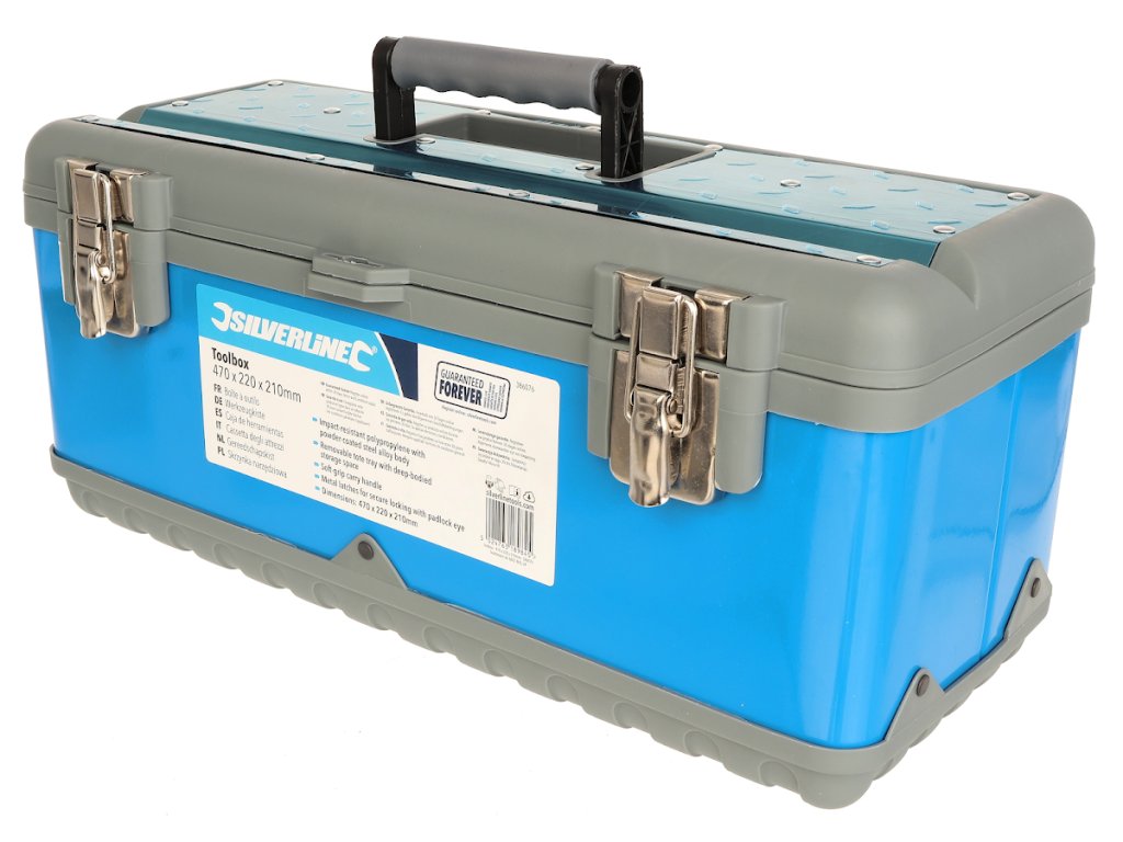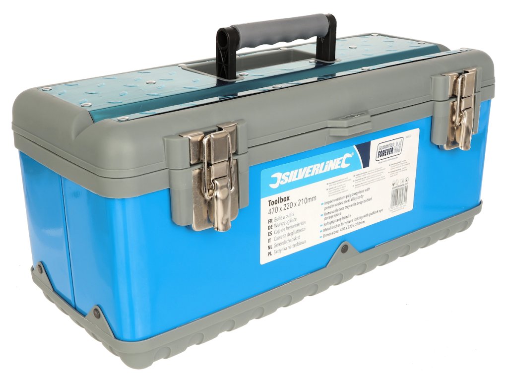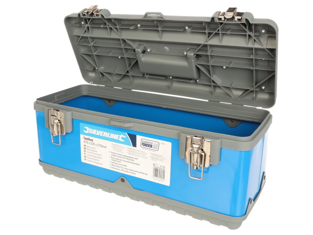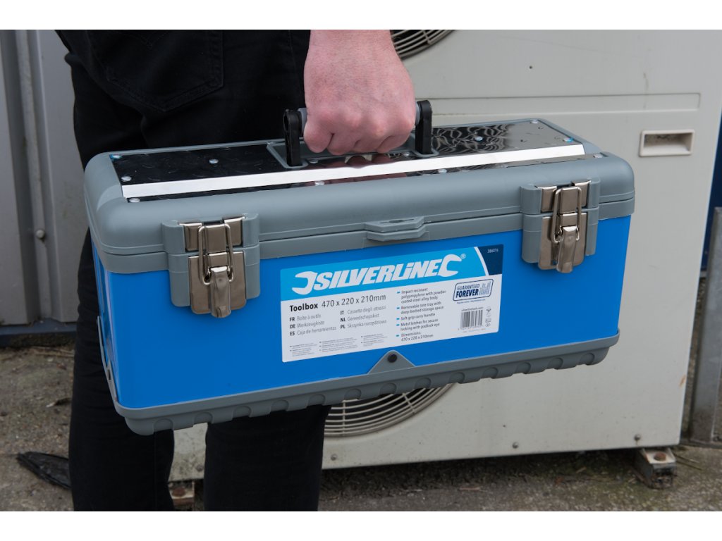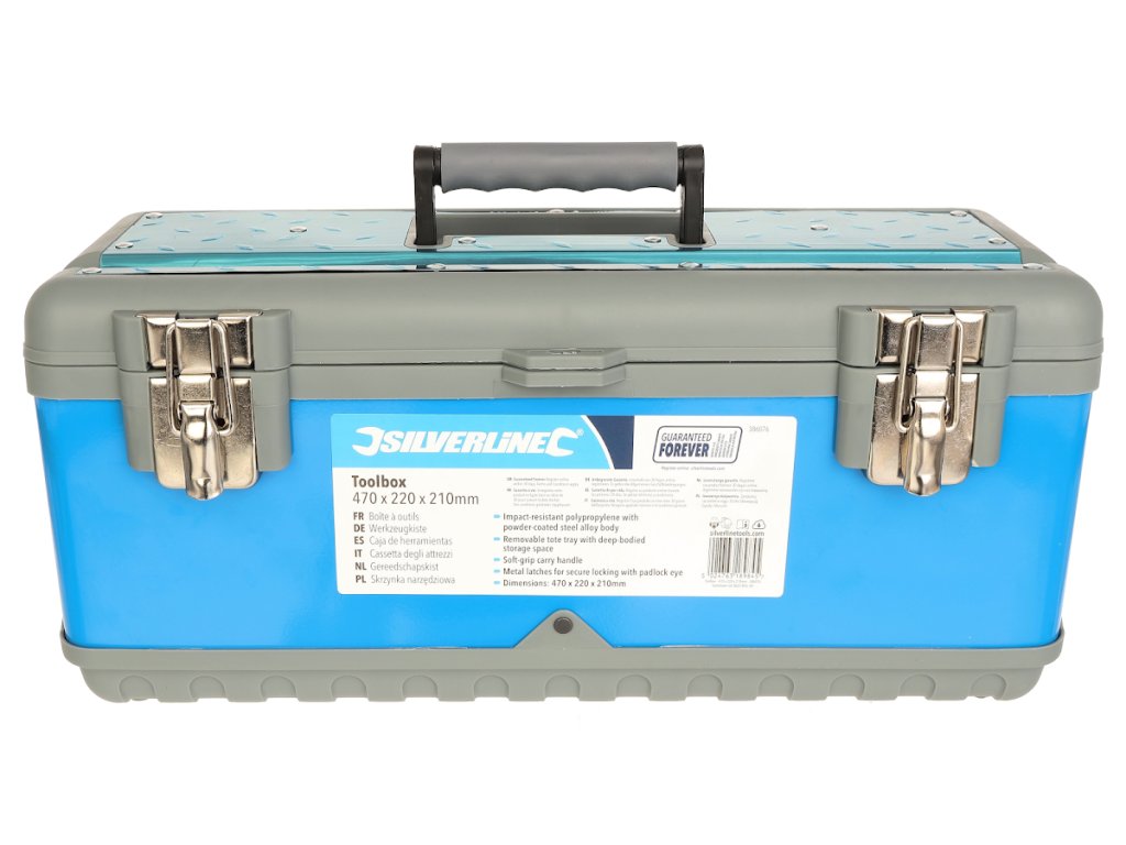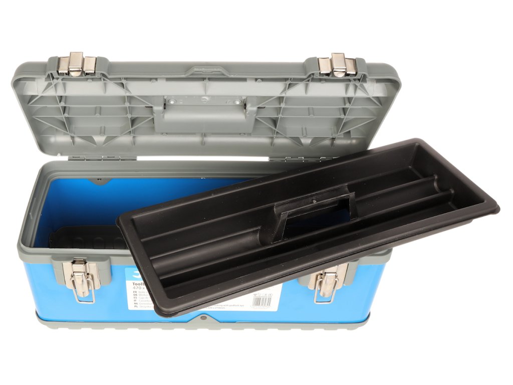 Kućište alata izdržljive konstrukcije od čelika i polipropilena. Uključuje uklonjivi organizator, metalne zasune za sigurno zaključavanje i oko za lokot. Veličina 470 × 220 × 210.