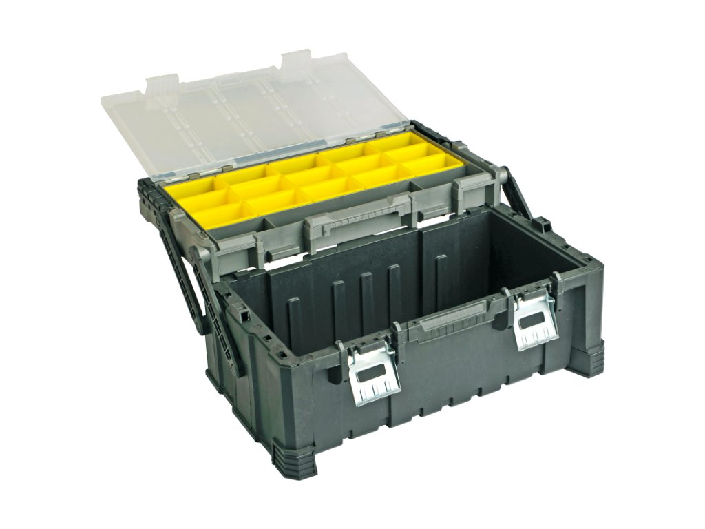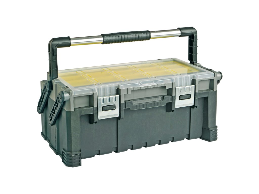 Organizator pogodan za uredno skladištenje pričvršćivača i alata. Prozirni gornji poklopac. Zahvaljujući nagibnom dizajnu, imate savršen pristup pohranjenom materijalu. Sklopiva ručka. Dimenzije: vanjski 565 × 305 × 250 mm; unutarnji (bez gornjeg organizatora) 465 × 220 × 165 mm.