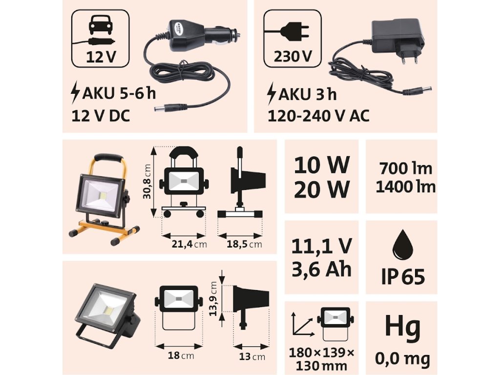 Prijenosni LED punjivi reflektor izvor je ugodnog bijelog svjetla koje odgovara kvaliteti dnevne svjetlosti. LED diode imaju malu potrošnju energije pri visokom intenzitetu svjetlosti. Reflektor se može koristiti kao prijenosni izvor svjetlosti s postoljem bez kabela za napajanje i bez potrebe za spajanjem na izvor napajanja. jer je izvor struje. Energija je prethodno napunjena baterija. Opremljen je prekidačem između 10 i 20 W i posebnim električnim krugom "Konstantna struja", koji dovodi konstantnu struju oko 6 h u postavci od 10 W i oko 4 h u postavci od 20 W, čime se osigurava maksimalna svjetlosna snaga svjetiljke za to vrijeme bez smanjenja intenziteta svjetla, a zatim se svjetiljka isključuje. Zahvaljujući mogućnosti punjenja iz utičnice automobila od 12 V, male veličine, mehaničke otpornosti, otpornosti na kišu, svjetiljka se može koristiti kao dio opreme za automobile i kao izvor svjetla na poslu, kampiranju, ribolovu, vrtlarstvu itd.
