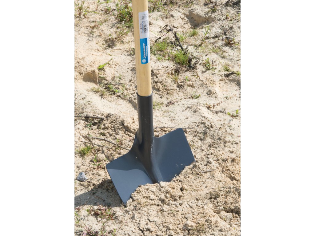 Utisnuta, čelična glava s površinom otpornom na koroziju. Lakirana, drvena ručka s T-ručkom. Oštrica L x Š: 270 x 270 mm. Težina glave 1,3 kg.