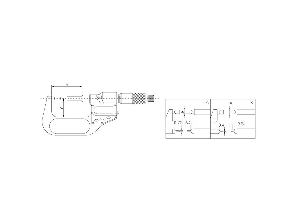 Analogni mikrometar za mjerenje vanjskih žljebova i drugih teško dostupnih površina, s čegrtaljkom i fiksnim, nerotirajućim vretenom i obojenim čeličnim okvirom. Osnovni pribor: Jamstveni list, priručnik s uputama, kalibracijski certifikat, plastična futrola.