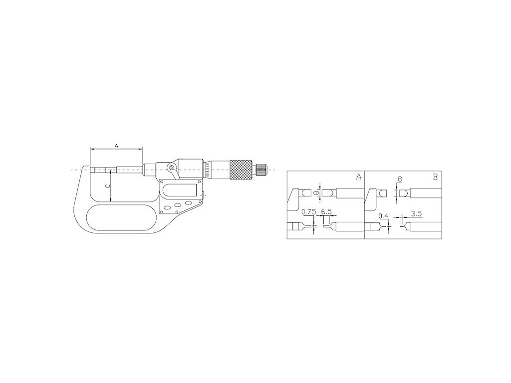 Analogni mikrometar za mjerenje vanjskih žljebova i drugih teško dostupnih površina, s čegrtaljkom i fiksnim, nerotirajućim vretenom i obojenim čeličnim okvirom. Osnovni pribor: Jamstveni list, priručnik s uputama, kalibracijski certifikat, plastična futrola.