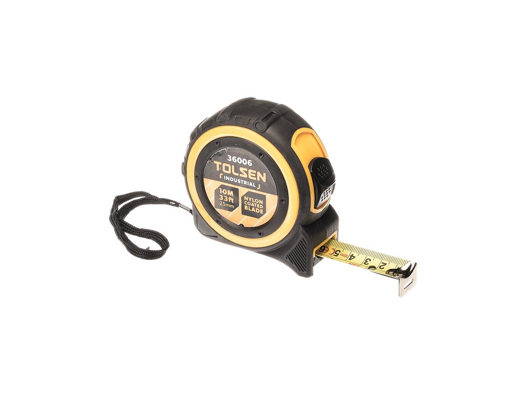Visokokvalitetno, mjerna traka, otporno na udarce, plastično tijelo presvučeno gumom, veliki gumb za mehanizam uvlačenja, klasa točnosti II, metrička i inčna ljestvica, dimenzija 10.000 × 25 mm.