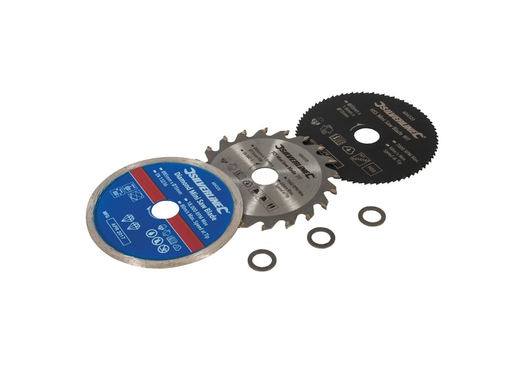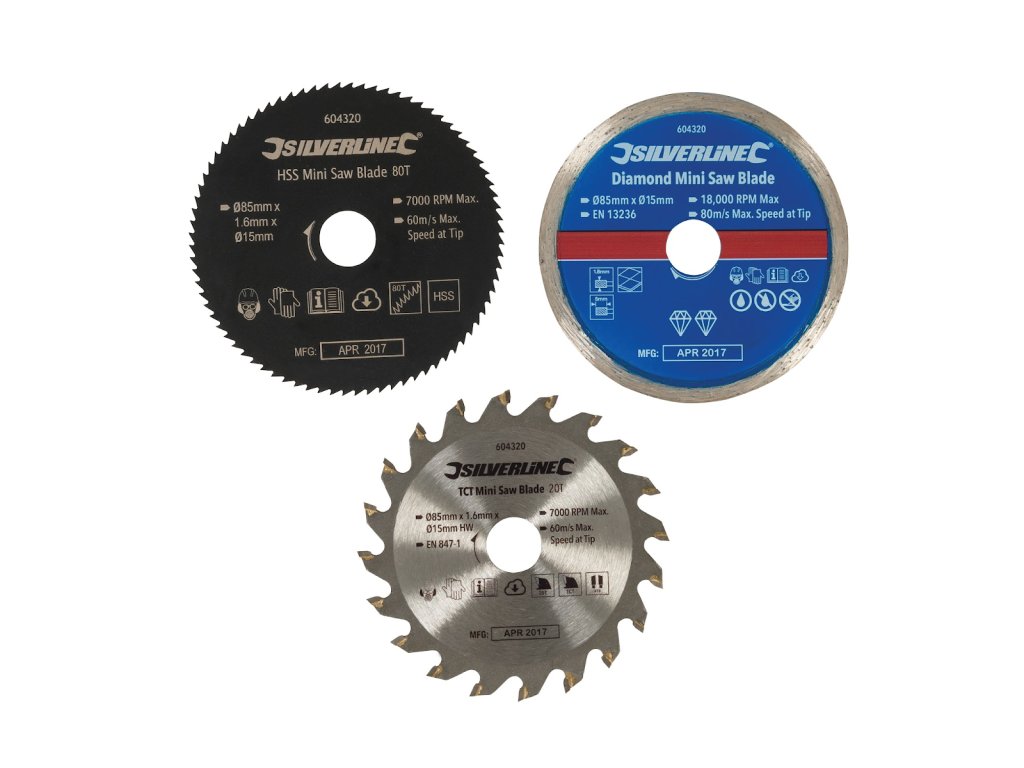 Set uključuje TCT oštricu od 20 zuba za drvo, HSS oštricu od 80 zuba za drvo, plastiku i leguru te dijamantnu oštricu za pločice. Provrt od 15 mm s 3 x redukcijska prstena u rupi od 10 mm. Kompatibilno sa silverline mini pilama.