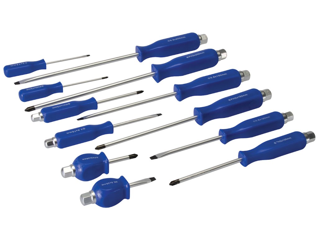 Magnetski odvijač postavljen s prolaznom rupom 6HR drška s mogućnošću umetanja ključa (osim najmanjih veličina). Plastična ručka, materijal S2 čelika. Sastav seta: 6 kom Pozidriv: 0 × 75; 1 × 75; 2 × 38; 2 × 100; 2 × 150 i 3 × 200 mm; 6 komada s prorezima: 3 × 75; 5 × 75; 6 × 38; 6 × 100; 6 × 150 i 8 × 200 mm.