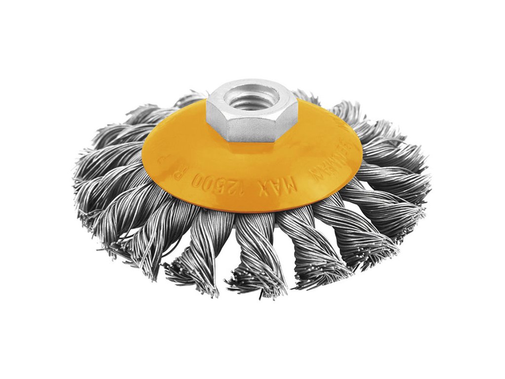 Idealno za uklanjanje hrđe i boje s metalnih površina. Promjer žice: 0,5 mm, promjer četke 100 mm, pričvrsna matica M14 × 2 mm, visina četke 40 mm, maksimalna brzina 12.500 o / min.