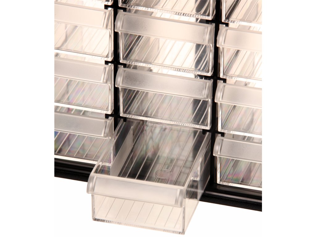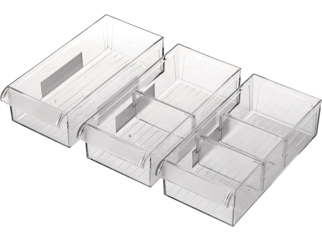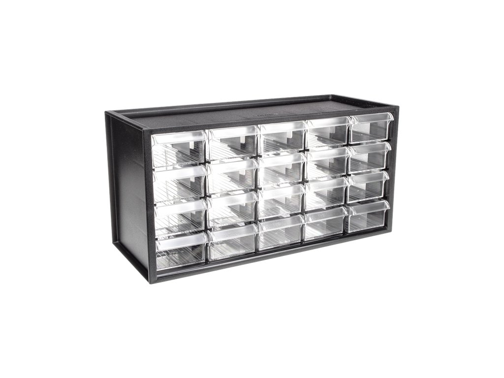 Uključuje 20 prozirnih ladica za izvlačenje, PP materijal, 4 gumene noge. Ukupna nosivost 50 kg, dimenzije 374 × 152 × 187 mm.