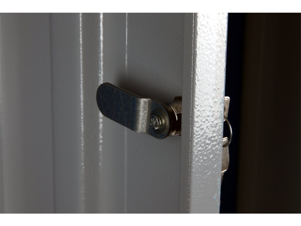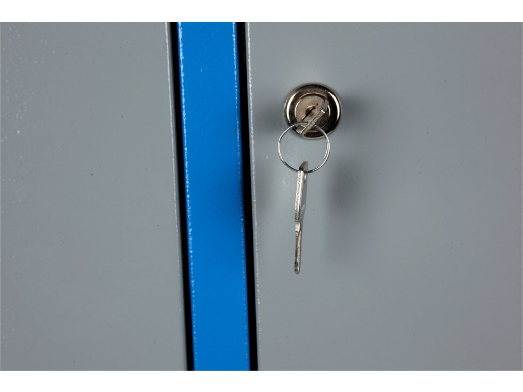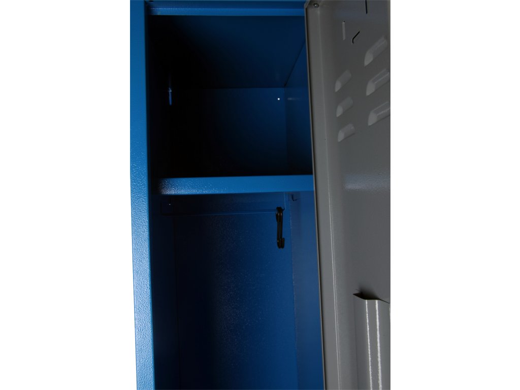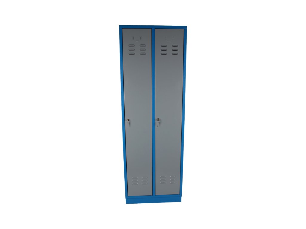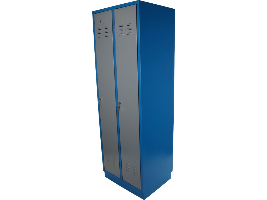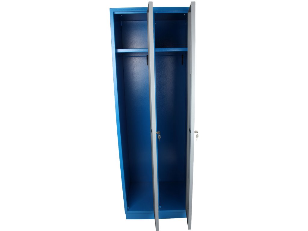 Metalna konstrukcija, dvobojni dizajn, 2 ojačana vrata, gornja polica s šipkom za stalak i 2 × S-kuka u svakom dijelu ormara, otvori za zrak na vrhu i dnu, oznake s imenom, postolje, cilindrična brava s okretnim čepom (2 tipke), unaprijed sastavljene. Dimenzije (Š × D. × H) 600 × 500 × 1.800 mm.