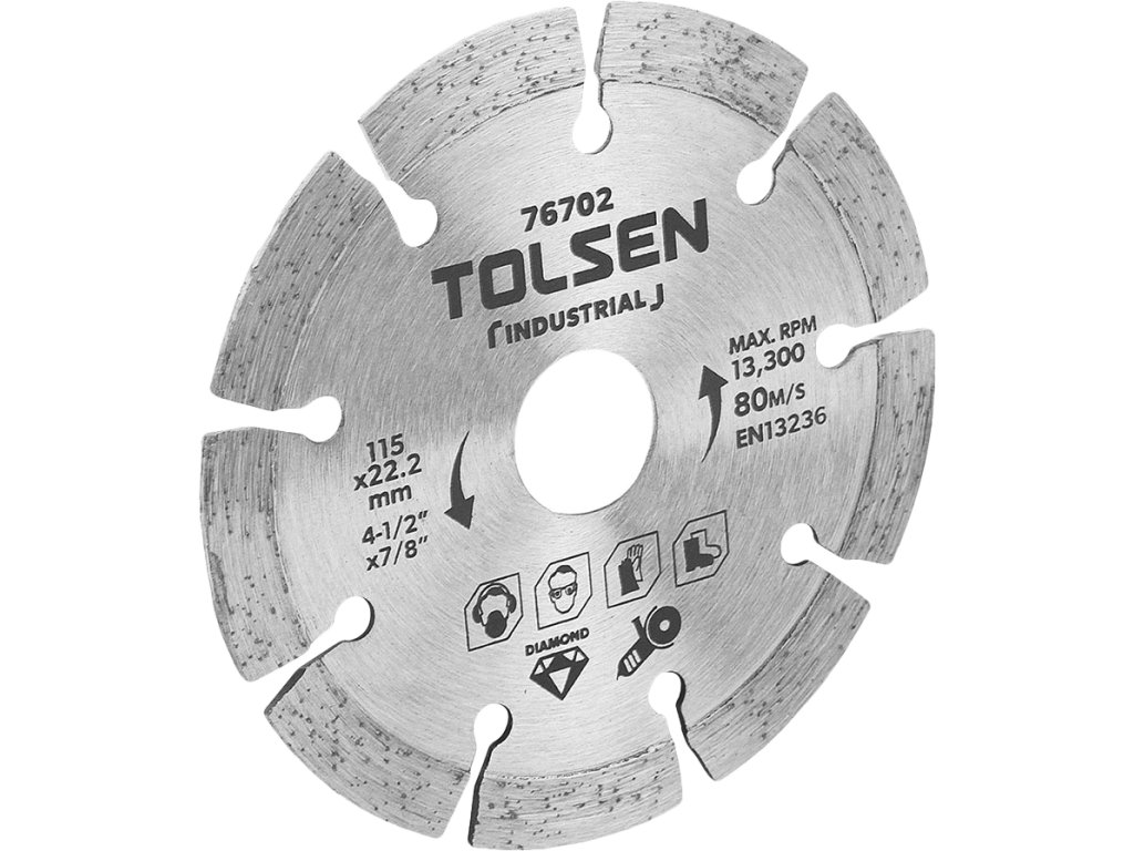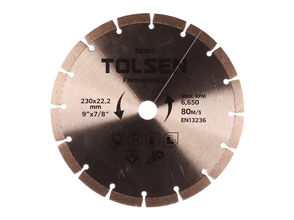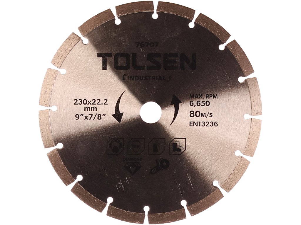 Visokokvalitetna oštrica dijamantnog segmenta dizajnirana je za suho rezanje ziđa, opeke, krovišta i drugih građevinskih materijala. Visina segmenta 10 mm. maksimalna brzina 6,650 o / min