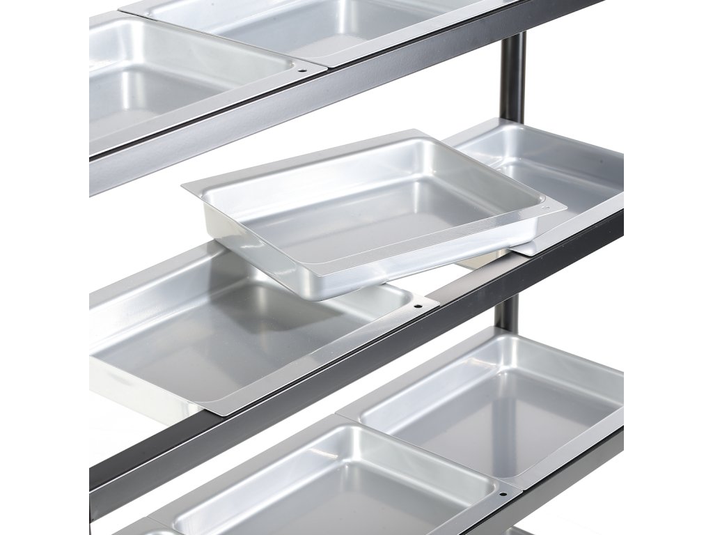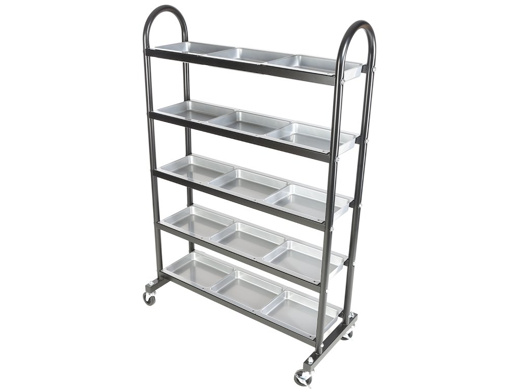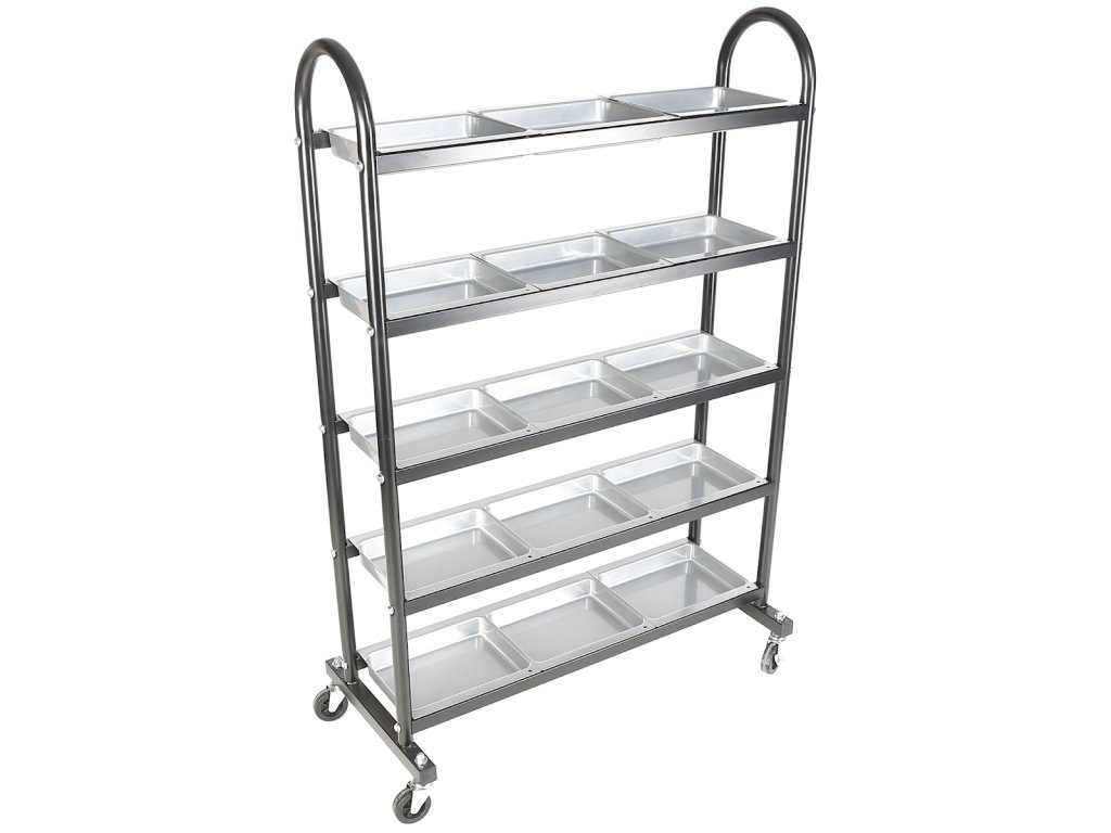 Metalni stalak s 15 spremnika dimenzija 248 × 180 × 39 mm. Dimenzije postolja: 1220 × 800 × 360 mm. Nosivost 150 kg. Opremljen je s 2 okretna kotačića i 2 kotačića s kočnicama.