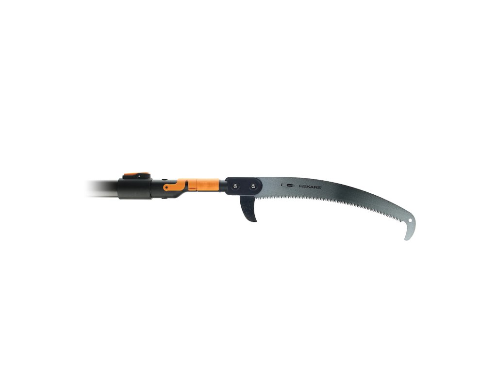 Set se sastoji od Fiskars pile za obrezivanje i teleskopske ručke. Kutna pila dizajnirana je za povlačenje rezova. Da bi se olakšao rad, ima zaustavljanje na početku i na kraju, pila ne izlazi iz reza. Rukav i brava izrađeni su od FiberComp materijala. List pile je očvrsnut, dugačak 360 mm. Sustav QuikFit omogućuje upotrebu jedne ručke na nekoliko priključaka alata. Visina: 35 mm, duljina: 560 mm, širina: 70 mm, težina: 390 g. Teleskopska ručka posebno je dizajnirana za rad na visinama - do visine od 6 metara. Ima dvostruku bravu za sigurnu upotrebu. Ručka je vrlo lagana, izrađena je od aluminija. Sustav QuikFit omogućuje kombiniranje različitih vrtnih alata s jednom ručkom. Duljina se može podesiti od 2280 do 4000 mm. Širina: 90 mm, duljina: 2280 mm, težina: 1600 g.