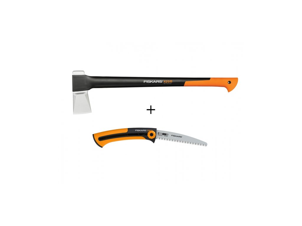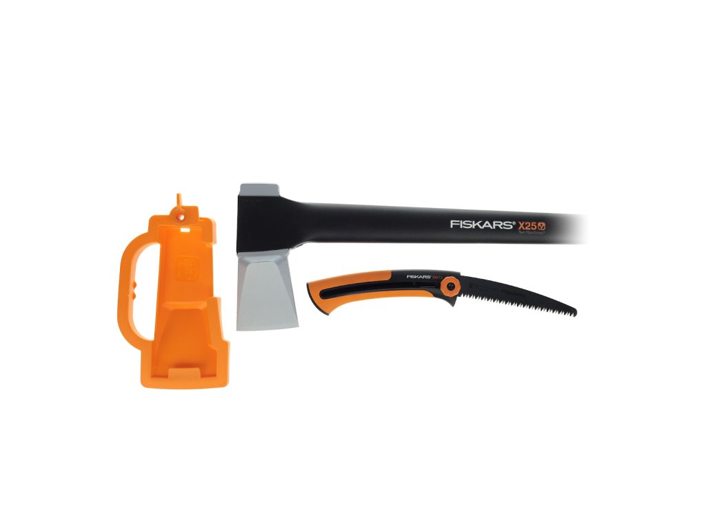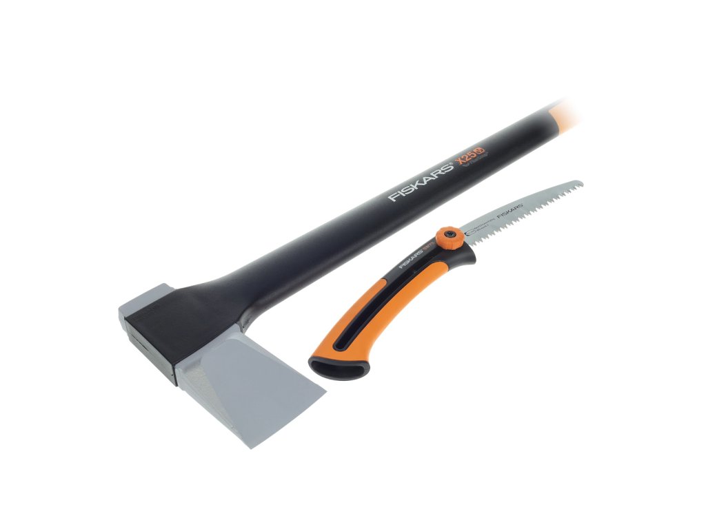 Set se sastoji od sjekire Fiskars X25 i vrtne pile. Sjekira za cijepanje pogodna je za cijepanje velikih trupaca promjera preko 30 cm. Ima vrlo laganu i jaku ručku izrađenu od FiberComp materijala, što smanjuje umor i čini sjekiru praktički neraskidivom. Zakrivljeni kraj ručke sprječava klizanje sjekire iz ruke. Sjekira ima produljeno jamstvo od 25 godina putem web registracije. Visina: 45 mm, duljina: 774 mm, širina: 235 mm. Težina: 2540 g. Vrtna pila pogodna je za rezanje svježih grana, rezanje grana promjera do 70 mm. Duljina oštrice: 160 mm. Duljina: 223 mm, duljina: 50 mm, težina: 130 g.