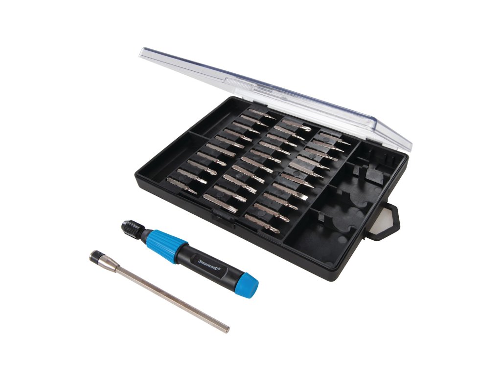 Set bitnih odvijača. Skup uključuje bitove: Phillips: PH000; PH00; PH0; PH1; stan 1.0; 1,5; 2,0; 2,5; 3,0; 3.5 i 4.0; Pozidriv: PZ0 i PZ1; Trx T4; T5; T6; T7; T8; T9; T10; T15 i T20; šesterokut 0,7; 0,9; 1,3; 1,5; 2,0; 2,5; 3.0 i 4.0, ručka i produžni priključak. Isporučuje se u izdržljivom plastičnom kućištu.
