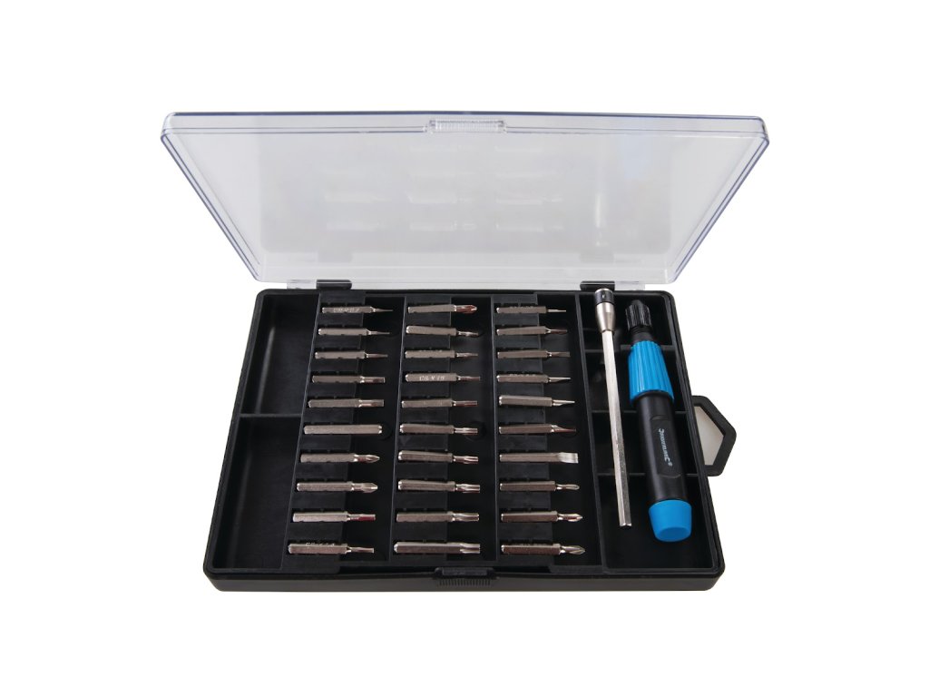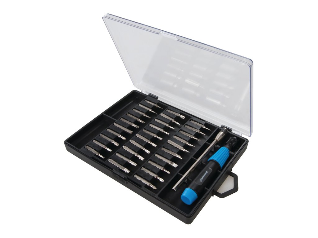 Set bitnih odvijača. Skup uključuje bitove: Phillips: PH000; PH00; PH0; PH1; stan 1.0; 1,5; 2,0; 2,5; 3,0; 3.5 i 4.0; Pozidriv: PZ0 i PZ1; Trx T4; T5; T6; T7; T8; T9; T10; T15 i T20; šesterokut 0,7; 0,9; 1,3; 1,5; 2,0; 2,5; 3.0 i 4.0, ručka i produžni priključak. Isporučuje se u izdržljivom plastičnom kućištu.