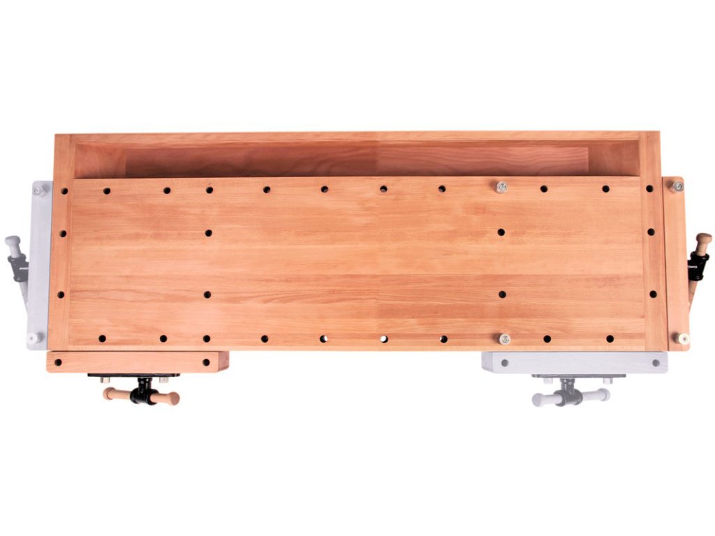 Klupa PREMIUM STAR dizajnirana je za veće radionice u kojima ima dovoljno prostora. Ovaj model je dizajniran na drugačiji način od ostalih klupa u PRO seriji. Klupa je opremljena s 2 masivna poroka - sprijeda i bočna. Oba škripca duga su 480 mm i široka 60 mm. Zahvaljujući dva reda rupa za pse na klupi, moguće je držati materijal u gotovo bilo kojoj širini i duljini. Svaki škripac ima 2 rupe za okrugle pse. Na tanjuru ćete pronaći 36 rupa za pse. Klupa je dizajnirana za velika opterećenja. Još jedna prednost ovog modela je priprema za promjenu poroka za ljevoruke - dešnjake. Ladica alata nudi mogućnost brzog spremanja najčešće korištenih alata. U podlozi klupe nalaze se 3 rupe za pse na klupi, koje, u kombinaciji s prednjim porokom, omogućuju vertikalno stezanje materijala. Dovetail konstrukcija klupe jamči najveću moguću čvrstoću i maksimalnu trajnost. Duž cijele duljine klupe nalazi se korito koje možete koristiti za pohranu alata ili ostataka materijala. Ladica alata nudi mogućnost brzog spremanja najčešće korištenih alata. Ovaj model zadovoljava najviše zahtjeve svih korisnika.