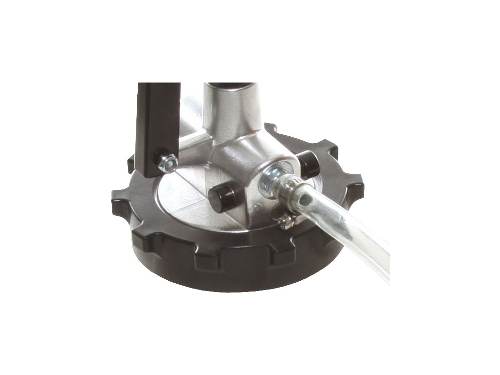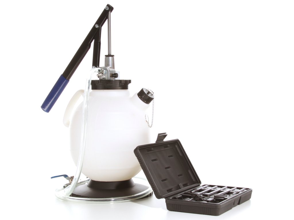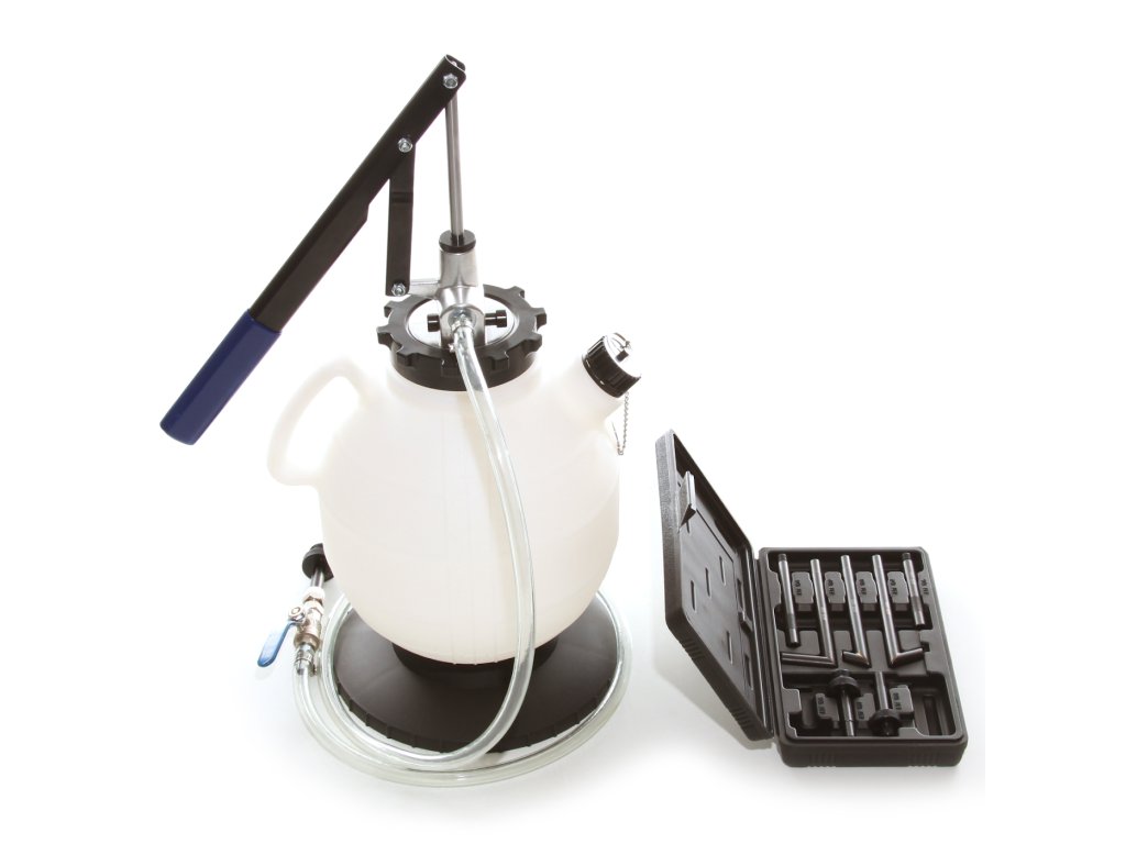 Uključuje plastični spremnik s ručnom polugom pumpe i set adaptera za vozila Ford, BMW, Honda, Nisan, VW/Audi, Porche, Mini Cooper, Mercedes, Volvo, Toyota/Lexus i Škoda. Pogodno za punjenje tekućina za podmazivanje diferencijala i mjenjača. Nije prikladno za goriva i otapala. Kapacitet spremnika 7,5 l; pomak po 1 klipnom pokretu 0,08 l.