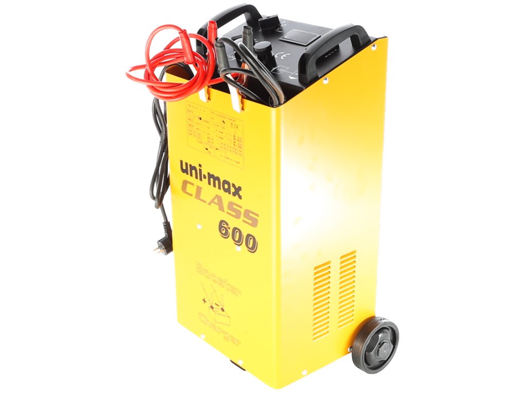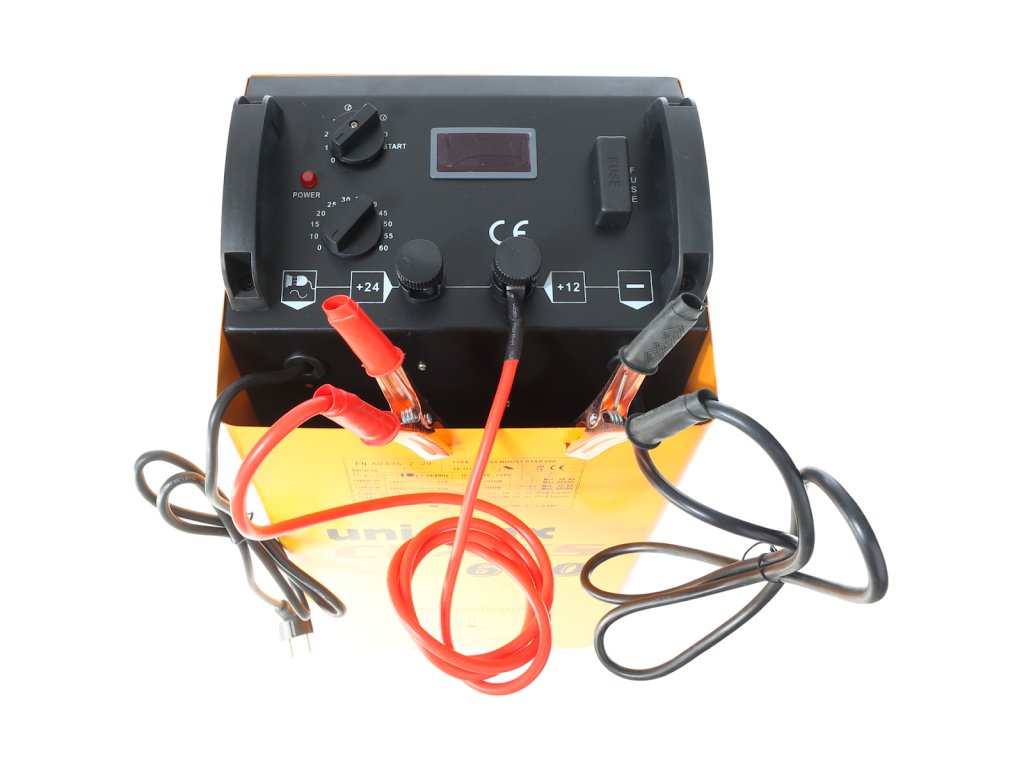 12/24 V punjač akumulatora automobila s opcijom izravnog pokretanja za sve vrste automobila. Izbor standardnog punjenja, brzo punjenje (s tajmerom), brzo pokretanje. Automatska zaštita od termistora. Kotači za jednostavno rukovanje. Može se koristiti za punjenje olovnih baterija i izravno pokretanje automobila, kamiona, traktora i traktora. Napajanje 230 V/50 Hz, potrošnja energije 12 V / 1.000 W, 24 V / 1.900 W. Maksimalna početna struja do 600 A..