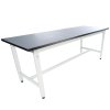 Fiksni radni stol izrađen od metalnih profila i podesivih završnih kapica na nogama kako bi se nadoknadila neravnina poda. Visina stola podesiva je u rasponu od 800 – 1.000 mm. Materijal ploče – MDF 25 mm + PVC 2 mm, dimenzija 2.100 × 750 mm.